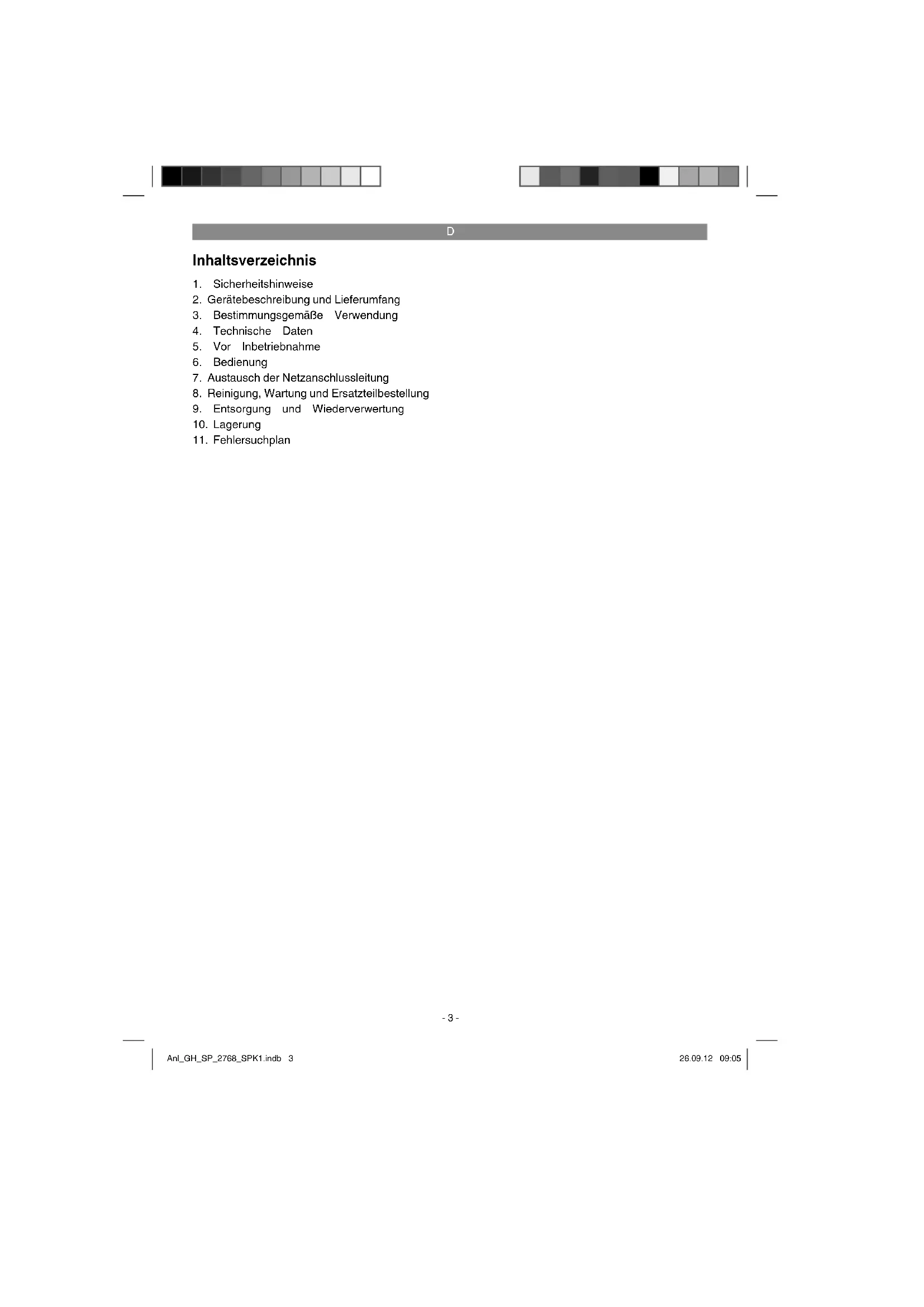Netzanschlussleitung Wenn die Netzanschlussleitung dieses Gerätes beschädigt wird, muss sie durch den Hersteller oder seinen Kundendienst oder eine ähnlich qua- lifi zierte Person ersetzt werden, um Gefährdun- gen zu vermeiden. Anl_GH_SP_2768_SPK1.indb 7Anl_GH_SP_2768_SPK1.indb 7 26.09.12 09:0526.09.12 09:05D