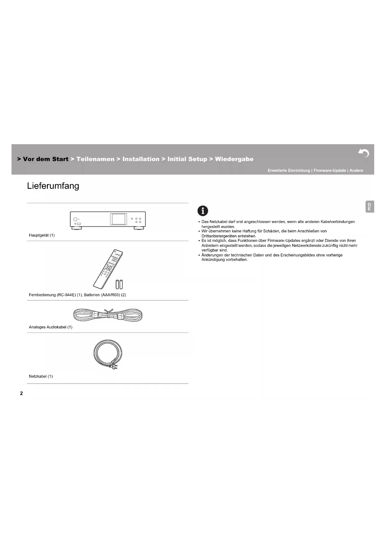 Lieferumfang Vor d em Start 0 Das Netzkabel darf erst angeschlossen werden, wenn alle anderen Kabelverbindungen hergestellt wurden. 0 Wir übernehmen keine Haftung für Schäden, die beim Anschließen von Drittanbietergeräten entstehen. 0 Es ist möglich, dass Funktionen über Firmware-Updates ergänzt oder Dienste von ihren Anbietern eingestellt werden, sodass die jeweiligen Netzwerkdienste zukünftig nicht mehr verfügbar sind. 0 Änderungen der technischen Daten und des Erscheinungsbildes ohne vorherige Ankündigung vorbehalten. Hauptgerät (1) Fernbedienung (RC-944E) (1), Batterien (AAA/R03) (2) Analoges Audiokabel (1) Netzkabel (1)> Vor dem Start > Teilenamen > Installation > Initial Setup > Wiedergabe Erweiterte Einrichtung | Firmware-Update | Andere