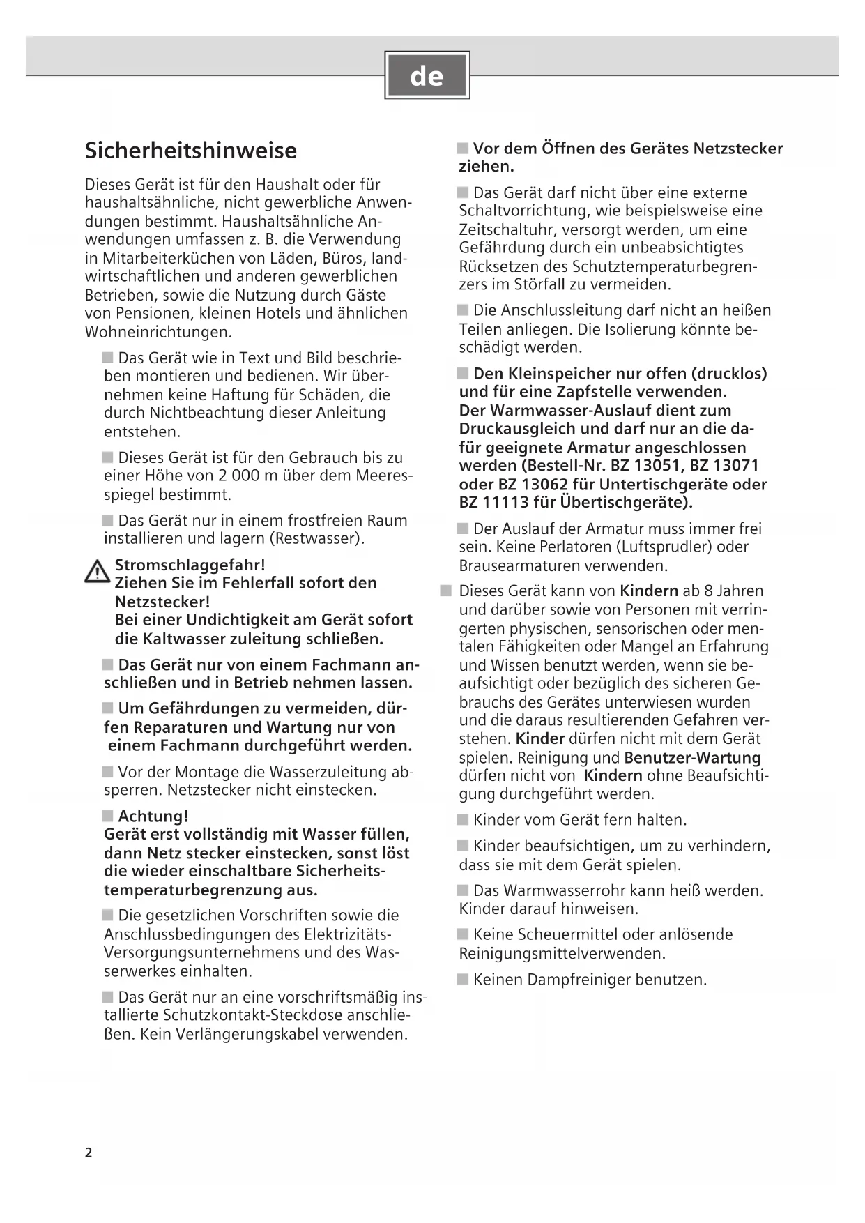 Sicherheitshinweise Dieses Gerät ist für den Haushalt oder für haushaltsähnliche, nicht gewerbliche Anwen- dungen bestimmt. Haushaltsähnliche An- wendungen umfassen z. B. die Verwendung in Mitarbeiterküchen von Läden, Büros, land- wirtschaftlichen und anderen gewerblichen Betrieben, sowie die Nutzung durch Gäste von Pensionen, kleinen Hotels und ähnlichen Wohneinrichtungen. ■ Das Gerät wie in Text und Bild beschrie- ben montieren und bedienen. Wir über- nehmen keine Haftung für Schäden, die durch Nichtbeachtung dieser Anleitung entstehen. ■ Dieses Gerät ist für den Gebrauch bis zu einer Höhe von 2 000 m über dem Meeres- spiegel bestimmt. ■ Das Gerät nur in einem frostfreien Raum installieren und lagern (Restwasser). Stromschlaggefahr! Ziehen Sie im Fehlerfall sofort den Netzstecker! Bei einer Undichtigkeit am Gerät sofort die Kaltwasser zuleitung schließen. ■ Das Gerät nur von einem Fachmann an- schließen und in Betrieb nehmen lassen. ■ Um Gefährdungen zu vermeiden, dür- fen Reparaturen und Wartung nur von einem Fachmann durchgeführt werden. ■ Vor der Montage die Wasserzuleitung ab- sperren. Netzstecker nicht einstecken. ■ Achtung! Gerät erst vollständig mit Wasser füllen, dann Netz stecker einstecken, sonst löst die wieder einschaltbare Sicherheits- temperaturbegrenzung aus. ■ Die gesetzlichen Vorschriften sowie die Anschlussbedingungen des Elektrizitäts- Versorgungsunternehmens und des Was- serwerkes einhalten. ■ Das Gerät nur an eine vorschriftsmäßig ins- tallierte Schutzkontakt-Steckdose anschlie- ßen. Kein Verlängerungskabel verwenden. ■ Vor dem Öffnen des Gerätes Netzstecker ziehen. ■ Das Gerät darf nicht über eine externe Schaltvorrichtung, wie beispielsweise eine Zeitschaltuhr, versorgt werden, um eine Gefährdung durch ein unbeabsichtigtes Rücksetzen des Schutztemperaturbegren- zers im Störfall zu vermeiden. ■ Die Anschlussleitung darf nicht an heißen Teilen anliegen. Die Isolierung könnte be- schädigt werden. ■ Den Kleinspeicher nur offen (drucklos) und für eine Zapfstelle verwenden. Der Warmwasser-Auslauf dient zum Druckausgleich und darf nur an die da- für geeignete Armatur angeschlossen werden (Bestell-Nr. BZ 13051, BZ 13071 oder BZ 13062 für Untertischgeräte oder BZ 11113 für Übertischgeräte). ■ Der Auslauf der Armatur muss immer frei sein. Keine Perlatoren (Luftsprudler) oder Brausearmaturen verwenden. ■ Dieses Gerät kann von Kindern ab 8 Jahren und darüber sowie von Personen mit verrin- gerten physischen, sensorischen oder men- talen Fähigkeiten oder Mangel an Erfahrung und Wissen benutzt werden, wenn sie be- aufsichtigt oder bezüglich des sicheren Ge- brauchs des Gerätes unterwiesen wurden und die daraus resultierenden Gefahren ver- stehen. Kinder dürfen nicht mit dem Gerät spielen. Reinigung und Benutzer-Wartung dürfen nicht von Kindern ohne Beaufsichti- gung durchgeführt werden. ■ Kinder vom Gerät fern halten. ■ Kinder beaufsichtigen, um zu verhindern, dass sie mit dem Gerät spielen. ■ Das Warmwasserrohr kann heiß werden. Kinder darauf hinweisen. ■ Keine Scheuermittel oder anlösende Reinigungsmittel verwenden. ■ Keinen Dampfreiniger benutzen.3