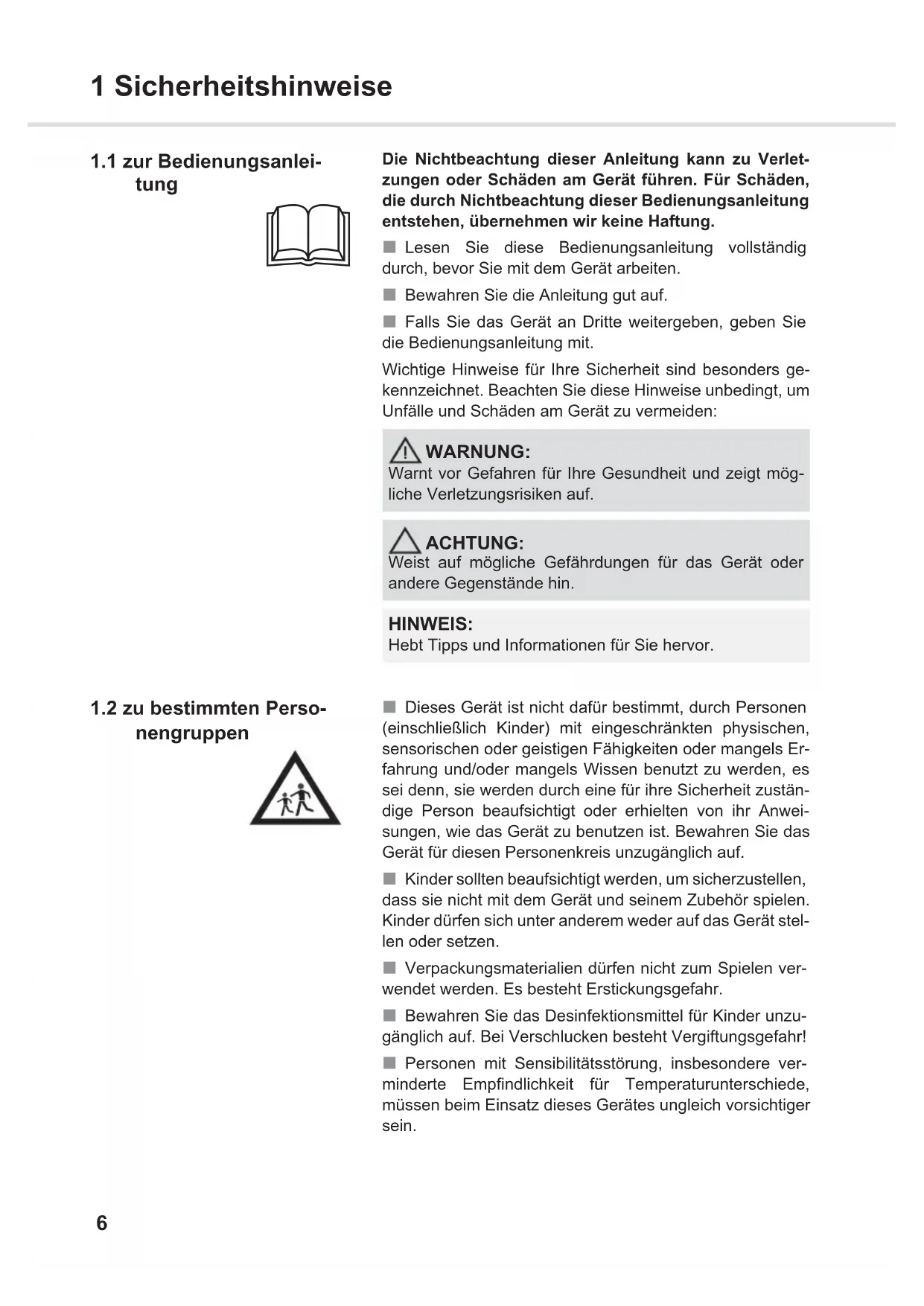 nengruppen Dieses Gerät ist nicht dafür bestimmt, durch Personen(einschließlich Kinder) mit eingeschränkten physischen,sensorischen oder geistigen Fähigkeiten oder mangels Er-fahrung und/oder mangels Wissen benutzt zu werden, essei denn, sie werden durch eine für ihre Sicherheit zustän-dige Person beaufsichtigt oder erhielten von ihr Anwei-sungen, wie das Gerät zu benutzen ist. Bewahren Sie dasGerät für diesen Personenkreis unzugänglich auf. Kinder sollten beaufsichtigt werden, um sicherzustellen,dass sie nicht mit dem Gerät und seinem Zubehör spielen.Kinder dürfen sich unter anderem weder auf das Gerät stel-len oder setzen. Verpackungsmaterialien dürfen nicht zum Spielen ver-wendet werden. Es besteht Erstickungsgefahr. Bewahren Sie das Desinfektionsmittel für Kinder unzu-gänglich auf. Bei Verschlucken besteht Vergiftungsgefahr! Personen mit Sensibilitätsstörung, insbesondere ver-minderte Empfindlichkeit für Temperaturunterschiede,müssen beim Einsatz dieses Gerätes ungleich vorsichtigersein. WARNUNG: Warnt vor Gefahren für Ihre Gesundheit und zeigt mög-liche Verletzungsrisiken auf. ACHTUNG: Weist auf mögliche Gefährdungen für das Gerät oderandere Gegenstände hin. HINWEIS: Hebt Tipps und Informationen für Sie hervor.