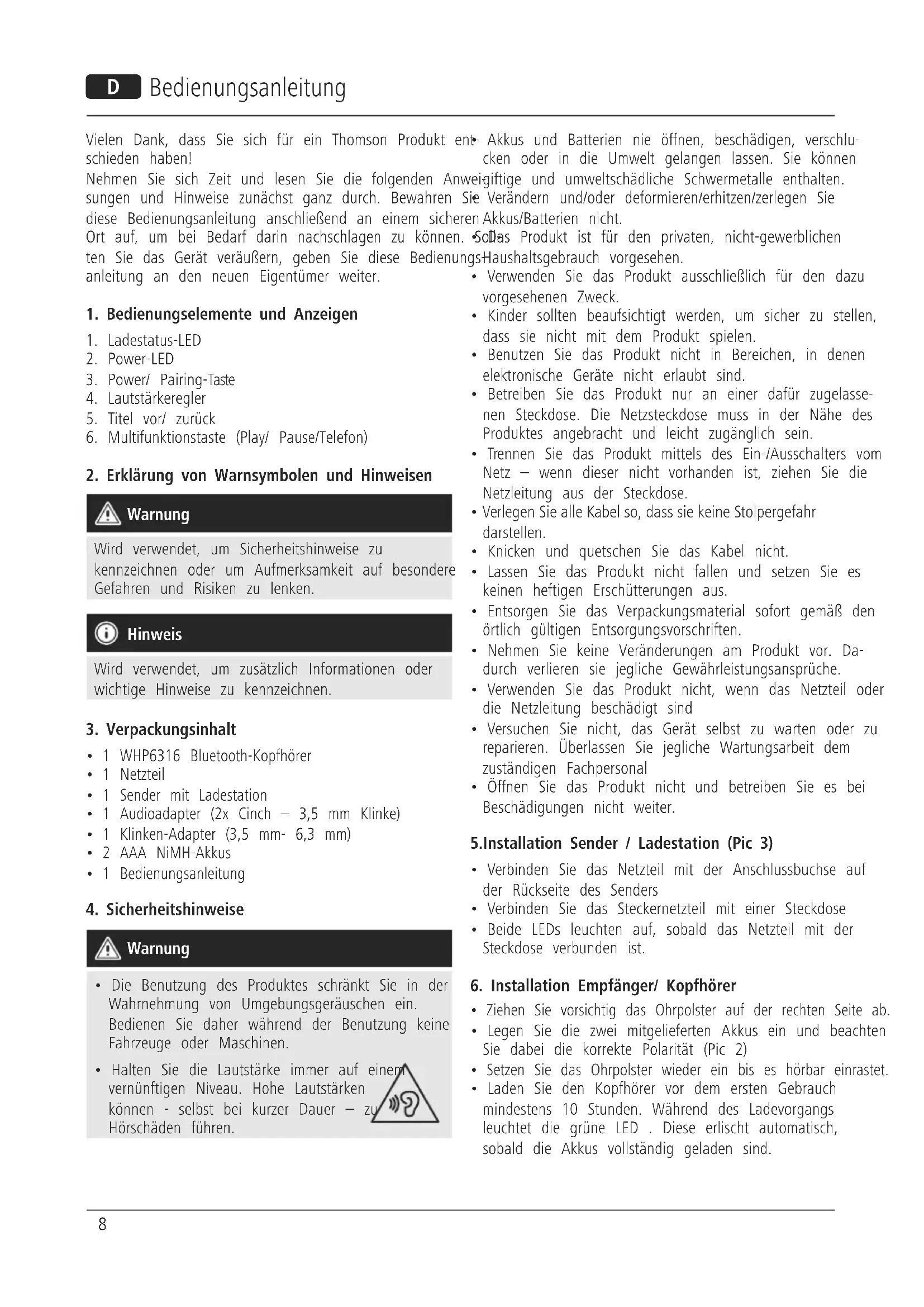- Die Benutzung des Produktes schränkt Sie in der Wahrnehmung von Umgebungsgeräuschen ein. Bedienen Sie daher während der Benutzung keine Fahrzeuge oder Maschinen.