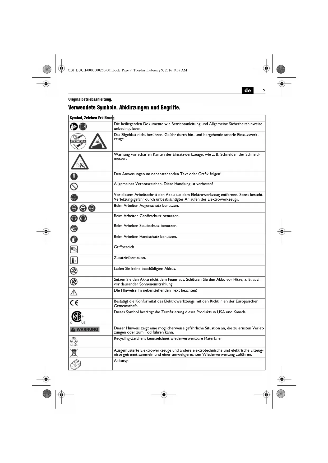 | Warnung vor scharfen Kanten der Einsatzwerkzeuge, wie z. B. Schnelden der Schneld-messer. | |