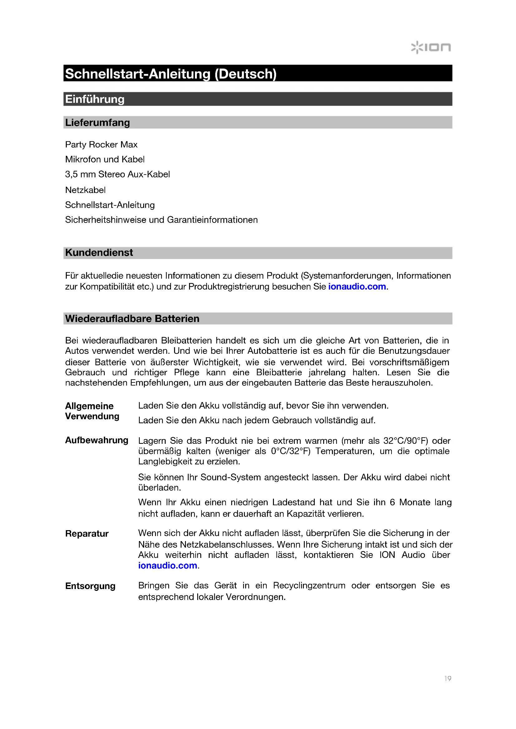 Wiederaufladbare Batterien Bei wiederaufladbaren Bleibatterien handelt es sich um die gleiche Art von Batterien, die in Autos verwendet werden. Und wie bei Ihrer Autobatterie ist es auch für die Benutzungsdauer dieser Batterie von äußerster Wichtigkeit, wie sie verwendet wird. Bei vorschriftsmäßigem Gebrauch und richtiger Pflege kann eine Bleibatterie jahrelang halten. Lesen Sie die nachstehenden Empfehlungen, um aus der eingebauten Batterie das Beste herauszuholen. Allgemeine Verwendung Laden Sie den Akku vollständig auf, bevor Sie ihn verwenden. Laden Sie den Akku nach jedem Gebrauch vollständig auf. Aufbewahrung Lagern Sie das Produkt nie bei extrem warmen (mehr als 32°C/90°F) oder übermäßig kalten (weniger als 0°C/32°F) Temperaturen, um die optimale Langlebigkeit zu erzielen. Sie können Ihr Sound-System angesteckt lassen. Der Akku wird dabei nicht überladen. Wenn Ihr Akku einen niedrigen Ladestand hat und Sie ihn 6 Monate lang nicht aufladen, kann er dauerhaft an Kapazität verlieren. Reparatur Wenn sich der Akku nicht aufladen lässt, überprüfen Sie die Sicherung in der Nähe des Netzkabelanschlusses. Wenn Ihre Sicherung intakt ist und sich der Akku weiterhin nicht aufladen lässt, kontaktieren Sie ION Audio über ionaudio.com. Entsorgung Bringen Sie das Gerät in ein Recyclingzentrum oder entsorgen Sie es entsprechend lokaler Verordnungen.20
