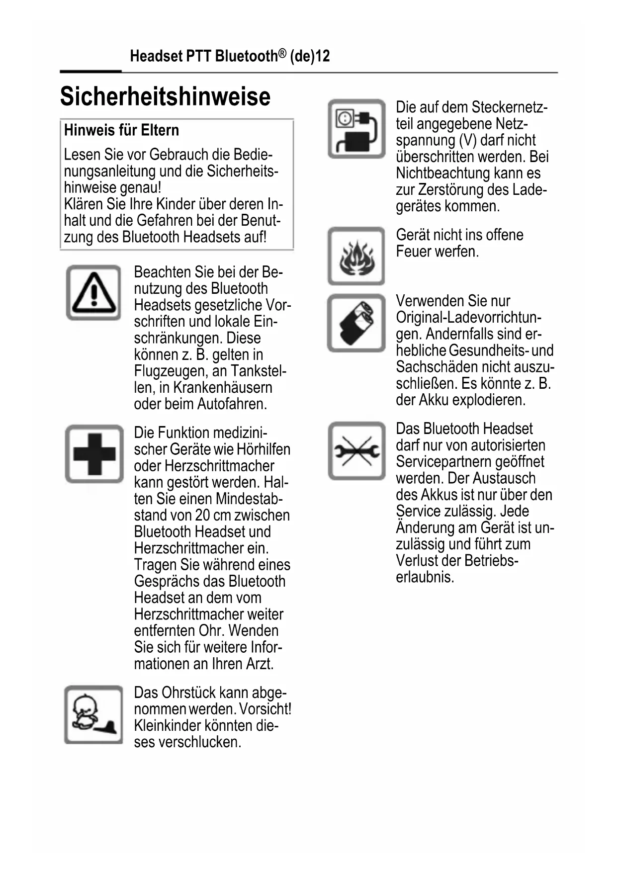 Sicherheitshinweise Hinweis für Eltern Lesen Sie vor Gebrauch die Bedie- nungsanleitung und die Sicherheits- hinweise genau! Klären Sie Ihre Kinder über deren In- halt und die Gefahren bei der Benut- zung des Bluetooth Headsets auf! Beachten Sie bei der Be- nutzung des Bluetooth Headsets gesetzliche Vor- schriften und lokale Ein- schränkungen. Diese können z. B. gelten in Flugzeugen, an Tankstel- len, in Krankenhäusern oder beim Autofahren. Die Funktion medizini- scher Geräte wie Hörhilfen oder Herzschrittmacher kann gestört werden. Hal- ten Sie einen Mindestab- stand von 20 cm zwischen Bluetooth Headset und Herzschrittmacher ein. Tragen Sie während eines Gesprächs das Bluetooth Headset an dem vom Herzschrittmacher weiter entfernten Ohr. Wenden Sie sich für weitere Infor- mationen an Ihren Arzt. Das Ohrstück kann abge- nommen werden. Vorsicht! Kleinkinder könnten die- ses verschlucken. Die auf dem Steckernetz- teil angegebene Netz- spannung (V) darf nicht überschritten werden. Bei Nichtbeachtung kann es zur Zerstörung des Lade- gerätes kommen. Gerät nicht ins offene Feuer werfen. Verwenden Sie nur Original-Ladevorrichtun- gen. Andernfalls sind er- hebliche Gesundheits- und Sachschäden nicht auszu- schließen. Es könnte z. B. der Akku explodieren. Das Bluetooth Headset darf nur von autorisierten Servicepartnern geöffnet werden. Der Austausch des Akkus ist nur über den Service zulässig. Jede Änderung am Gerät ist un- zulässig und führt zum Verlust der Betriebs- erlaubnis.13Headset PTT Bluetooth