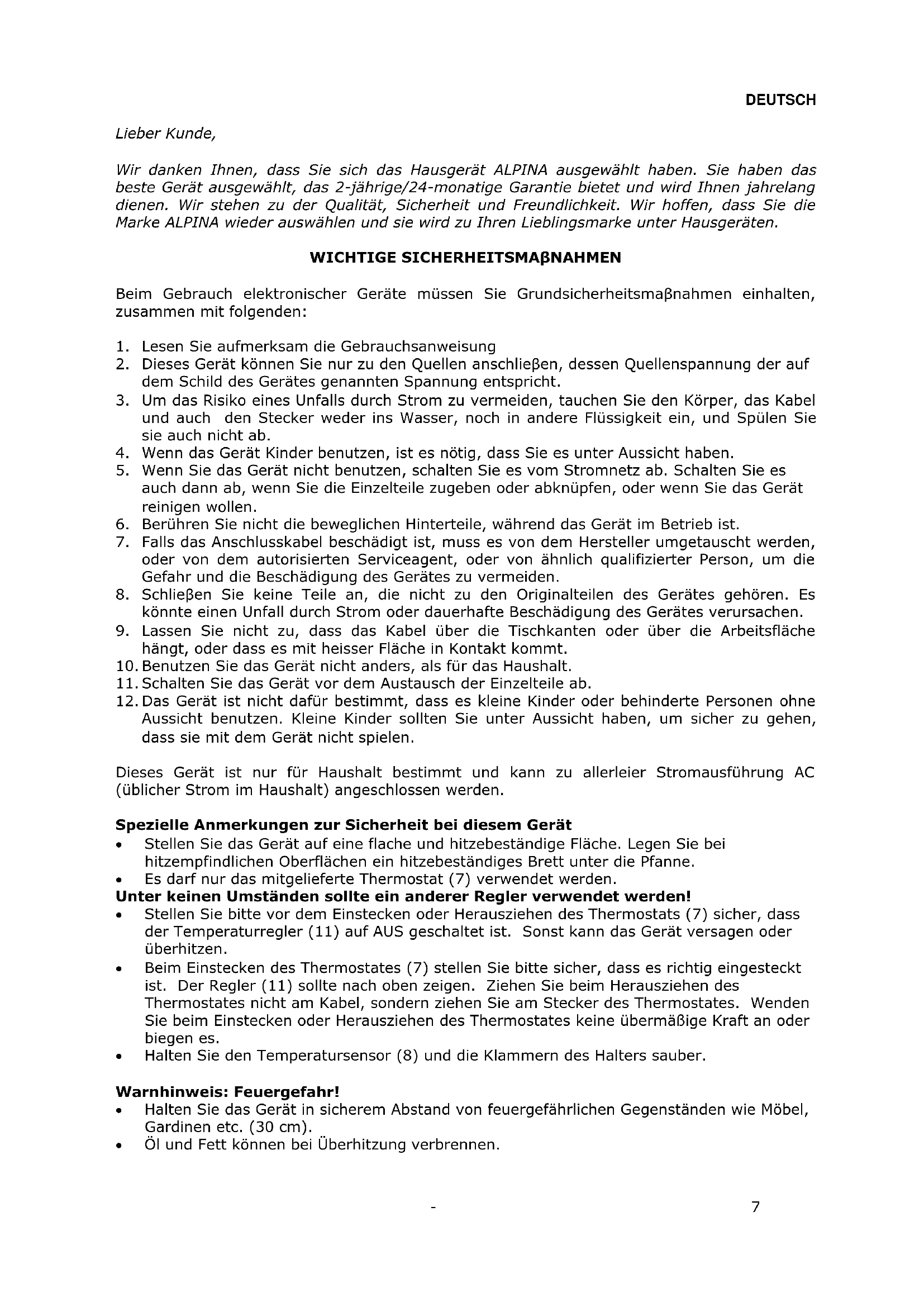 Wir danken Ihnen, dass Sie sich das Hausgerät ALPINA ausgewählten haben. Sie haben das Beste Gerät ausgewählt, das 2-jährige/24-monatige Garantie bietet und wird Ihnen jahrelang dieren. Wir stehen zu der Qualität, Sicherheit und Freundlichkeit. Wir hoffen, dass Sie die Marke ALPINA wieder auswahlen und sie wird zu ihren Lieblingsmarke unter Hausgeräten.