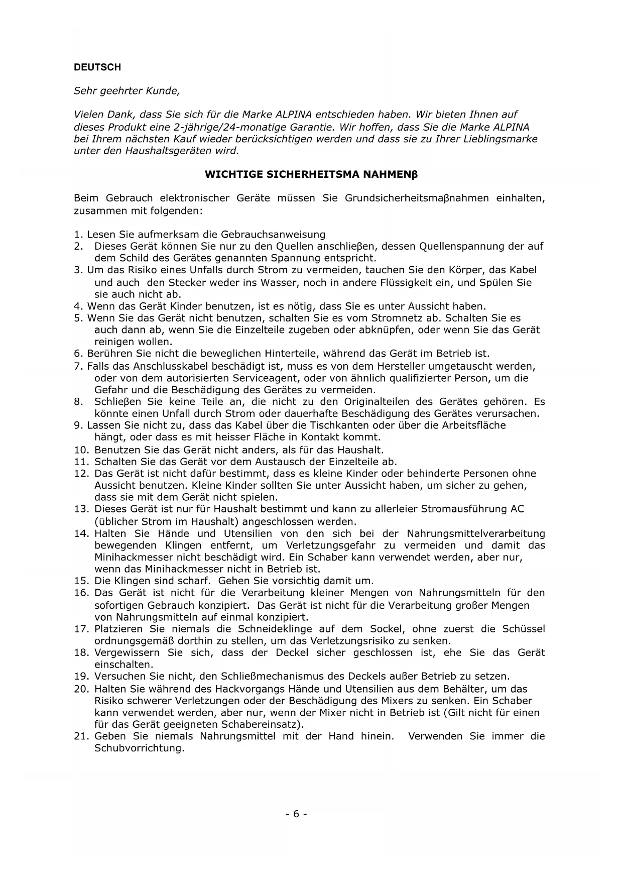 Tauchen Sie den Sockel nicht in Wasser. GEWÄHRLEISTUNG Dieses Produkt hat vom Kauftag an eine 2-jährige Garantie auf beschädigtes Material oder auf Herstellfehler. In dieser Gewährleistung verpflichtet sich der Hersteller, dass er ein beschädigtes Gerät reparieren oder austauschen wird. Diese Garantie ist nur dann gültig, wenn das Gerät gemäss Gebrauchsanweisung benutzt wurde und unter der Voraussetzung, dass es nicht verändert oder repariert wurde, bzw. dass darin keine unberechtigte Person eingegriffen hat und dass das Gerät nicht falsch behandelt wurde. Diese Garantie bezieht sich nicht auf Abnutzung und Verschleiss, auch nicht auf zerbrechliche Dinge wie zum Beispiel Keramik-Teile, Glühbirnen, usw. Falls das Produkt nicht funktioniert und es zurückgegeben werden muss, packen Sie es sorgfältig ein, legen Sie Ihren Namen, Ihre Adresse, und den Grund der Rückgabe bei und bringen Sie es zurück zur Einkaufsadresse . Wenn die Garantie noch gültig ist, legen Sie Garantiekarte und den Kaufbeleg bei. - 8 -FRANÇAIS Cher client, Nous vous remercions d’avoir choisi la marque ALPINA. Nous vous offrons sur cet appareil une garantie de 2 ans / 24 mois. Nous espérons que vous choisirez à nouveau nos produits lors d’un prochain achat afin que ALPINA devienne votre marque attitrée en matière de petit électroménager.
