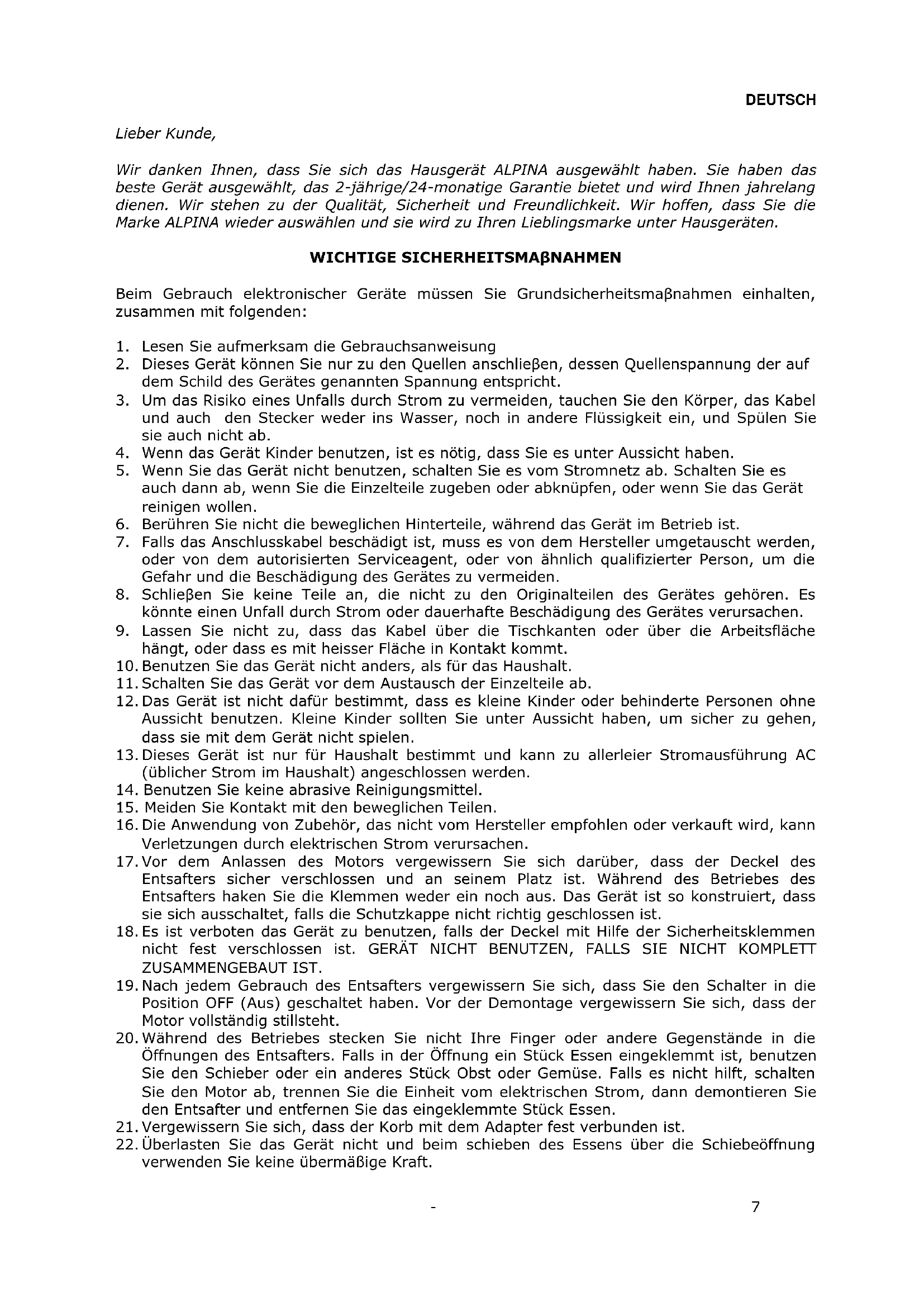 Lieber Kunde, Wir danken Ihnen, dass Sie sich das Hausgerät ALPINA ausgewählt haben. Sie haben das beste Gerät ausgewählt, das 2-jährige/24-monatige Garantie bietet und wird Ihnen jahrelang dienen. Wir stehen zu der Qualität, Sicherheit und Freundlichkeit. Wir hoffen, dass Sie die Marke ALPINA wieder auswählen und sie wird zu Ihren Lieblingsmarke unter Hausgeräten. WICHTIGE SICHERHEITSMAβNAHMEN Beim Gebrauch elektronischer Geräte müssen Sie Grundsicherheitsmaβnahmen einhalten, zusammen mit folgenden: