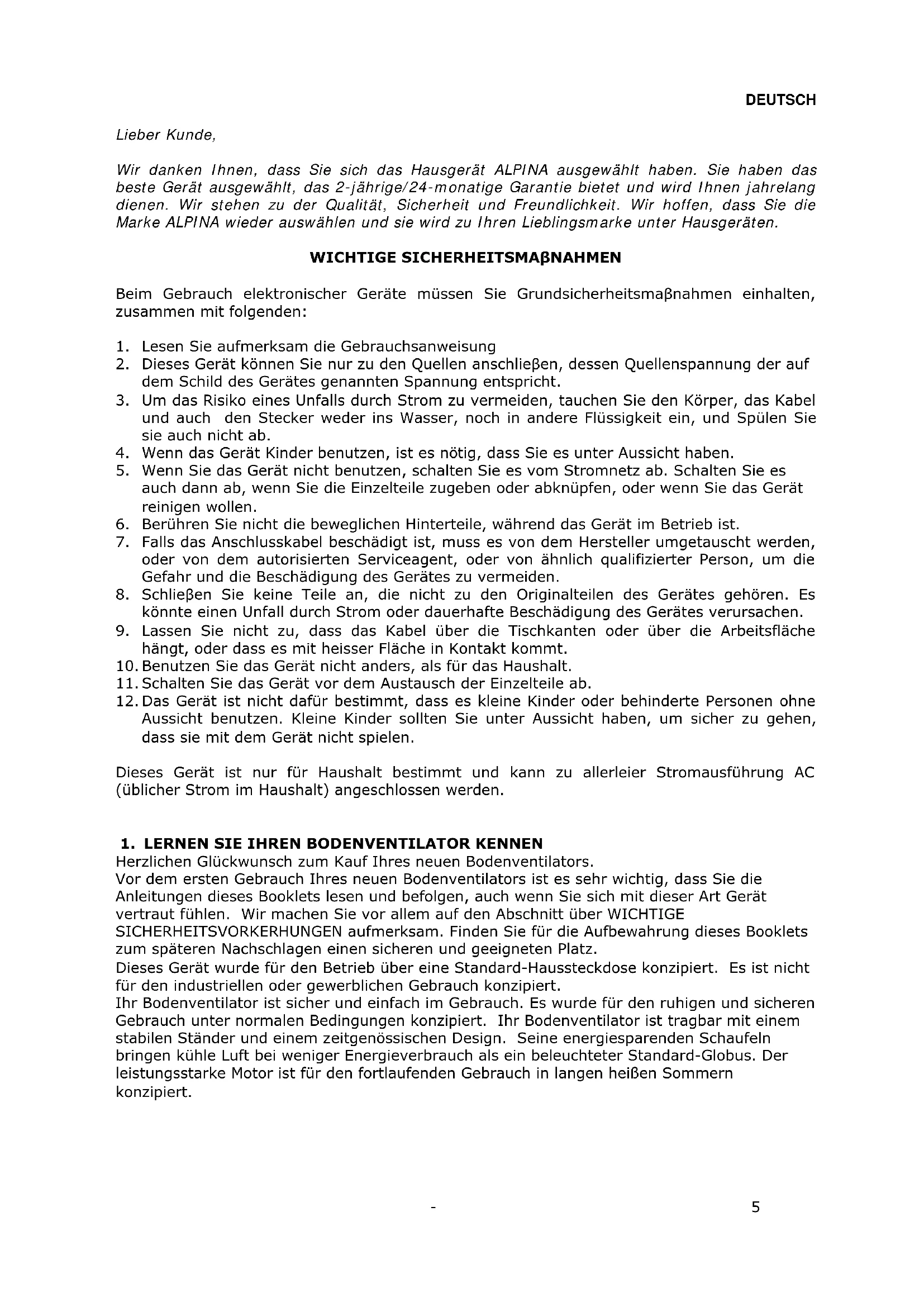 Vor dem ersten Gebrauch Ihres neuen Bodenventilators ist es sehr wichtig, dass Sie die Anleitungen dieses Booklets lesen und befolgen, auch wenn Sie sich mit dieser Art Gerät vertraut fühlen. Wir machen Sie vor allem auf den Abschnitt über WICHTIGE