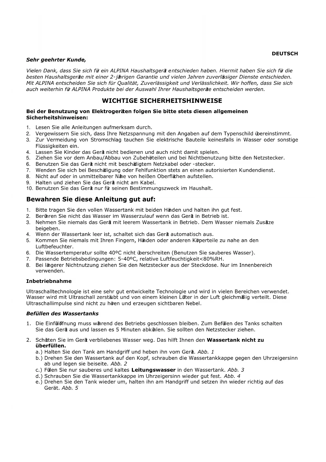 Vielen Dank, dass Sie sich für ein ALPINA Haushaltsgerä entschieden haben. Hiermit haben Sie sich für die besten Haushaltsgerä mit einer 2-jährigen Garantie und vielen Jahren zuverlösiger Dienste entschieden. Mit ALPINA entscheiden Sie sich für Qualität, Zuverlösigkeit und Verlächlichkeit. Wir hoffen, dass Sie sich auch weiterhin für ALPINA Produkte bei der Auswahl ihrer Haushaltsgerä entscheiden werden.