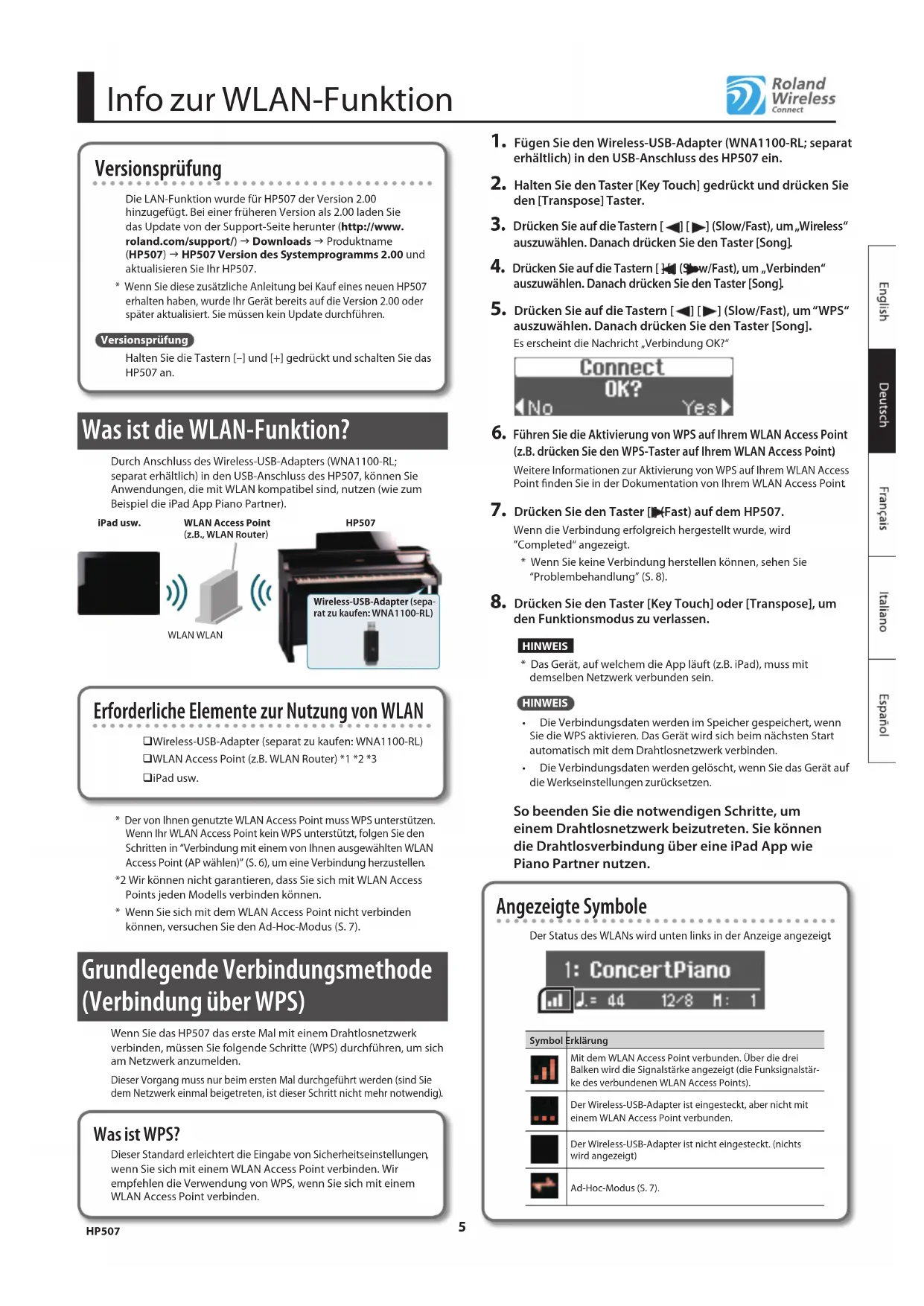 - Is the wireless LAN access point set to allow communication between wireless LAN devices? For details on settings, refer to the owner’s manual of your wireless LAN access point.Your iPad won’t connect to the Internet• Is the wireless LAN access point connected to the Internet?• Could you be connected in Ad-Hoc mode? The iPad or other wireless device connected in Ad-Hoc mode will be unable to communicate with the Internet or with another wireless device. However, an iPad or other wireless device that has cellular capability will be able to connect to the Internet via the cellular connection. Please be aware that if you use a cellular connection for Internet connectivity, you may incur costs depending on your rate plan. Company names and product names appearing in this document are registered trademarks or trademarks of their respective owners. Copyright © 2012 ROLAND EUROPE All rights reserved. No part of this publication may be reproduced in any form without the written permission of ROLAND EUROPE. Checking the MAC Address The MAC address indicated on the bottom of the wireless USB adapter (WNA1100-RL; sold separately). 1PS5 Info zur WLAN-Funktion Versionsprüfung Die LAN-Funktion wurde für HP507 der Version 2.00 hinzugefügt. Bei einer früheren Version als 2.00 laden Sie das Update von der Support-Seite herunter (http://www. roland.com/support/) g Downloads g Produktname (HP507) g HP507 Version des Systemprogramms 2.00 und aktualisieren Sie Ihr HP507.* Wenn Sie diese zusätzliche Anleitung bei Kauf eines neuen HP507 erhalten haben, wurde Ihr Gerät bereits auf die Version 2.00 oder später aktualisiert. Sie müssen kein Update durchführen VersionsprüfungHalten Sie die Tastern [–] und [+] gedrückt und schalten Sie das HP507 an. Was ist die WLAN-Funktion? Durch Anschluss des Wireless-USB-Adapters (WNA1100-RL; separat erhältlich) in den USB-Anschluss des HP507, können Sie Anwendungen, die mit WLAN kompatibel sind, nutzen (wie zum Beispiel die iPad App Piano Partner).HP507Wireless-USB-Adapter (sepa-rat zu kaufen: WNA1100-RL)WLAN Access Point (z.B., WLAN Router)WLAN WLANiPad usw. Erforderliche Elemente zur Nutzung von WLAN Wireless-USB-Adapter (separat zu kaufen: WNA1100-RL) WLAN Access Point (z.B. WLAN Router) *1 *2 *3 iPad usw.* Der von Ihnen genutzte WLAN Access Point muss WPS unterstützen. Wenn Ihr WLAN Access Point kein WPS unterstützt, folgen Sie den Schritten in “Verbindung mit einem von Ihnen ausgewählten WLAN Access Point (AP wählen)” (S. 6), um eine Verbindung herzustellen *2 Wir können nicht garantieren, dass Sie sich mit WLAN Access Points jeden Modells verbinden können.* Wenn Sie sich mit dem WLAN Access Point nicht verbinden können, versuchen Sie den Ad-Hoc-Modus (S. 7). Grundlegende Verbindungsmethode (Verbindung über WPS) Wenn Sie das HP507 das erste Mal mit einem Drahtlosnetzwerk verbinden, müssen Sie folgende Schritte (WPS) durchführen, um sich am Netzwerk anzumelden. Dieser Vorgang muss nur beim ersten Mal durchgeführt werden (sind Sie dem Netzwerk einmal beigetreten, ist dieser Schritt nicht mehr notwendig)