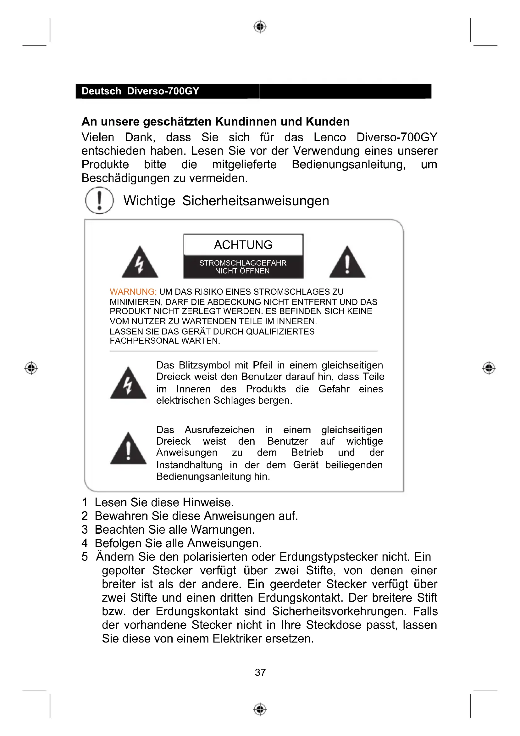 Dit symbool geeft aan dat het betreffende elektrische product of de batterij niet moet worden verwijderd als algemeen huishoudelijk afval in Europa. Zorg voor een juiste afvalverwerking door het product en de batterij in overeenstemming met alle van toepassing zijnde lokale wetten voor het verwijderen van elektrische apparatuur of batterijen te verwijderen. Als u dit doet, helpt u de natuurlijke hulpbronnen te behouden en de standaard van milieubescherming te verbeteren bij de behandeling en verwijdering van elektrisch afval (Afgedankte Elektrische en Elektronische Apparatuur).36 CE-MARKERING Producten met een CE-keurmerk houden zich aan de EMC-richtlijn (2014/30/EU) en de Richtlijn voor Lage Voltage (2014/35/EU) uitgegeven door de Europese Commissie. Hierbij verklaart Lenco Benelux BV, Thermiekstraat 1a, 6361 HB Nuth, Nederland, dat dit product voldoet aan de essentiële eisen en andere relevante bepalingen van Richtlijn 2014/53/EU. De conformiteitsverklaring kan worden geraadpleegd via techdoc@lenco.com SERVICE Voor meer informatie en ondersteuning van de helpdesk, kunt u terecht op www.lenco.com Lenco Benelux BV, Thermiekstraat 1a, 6361 HB, Nederland.37 Deutsch Diverso-700GY An unsere geschätzten Kundinnen und Kunden Vielen Dank, dass Sie sich für das Lenco Diverso-700GY entschieden haben. Lesen Sie vor der Verwendung eines unserer Produkte bitte die mitgelieferte Bedienungsanleitung, um Beschädigungen zu vermeiden. Wichtige Sicherheitsanweisungen 1 Lesen Sie diese Hinweise. 2 Bewahren Sie diese Anweisungen auf. 3 Beachten Sie alle Warnungen. 4 Befolgen Sie alle Anweisungen. 5 Ändern Sie den polarisierten oder Erdungstypstecker nicht. Ein gepolter Stecker verfügt über zwei Stifte, von denen einer breiter ist als der andere. Ein geerdeter Stecker verfügt über zwei Stifte und einen dritten Erdungskontakt. Der breitere Stift bzw. der Erdungskontakt sind Sicherheitsvorkehrungen. Falls der vorhandene Stecker nicht in Ihre Steckdose passt, lassen Sie diese von einem Elektriker ersetzen. ACHTUNG
