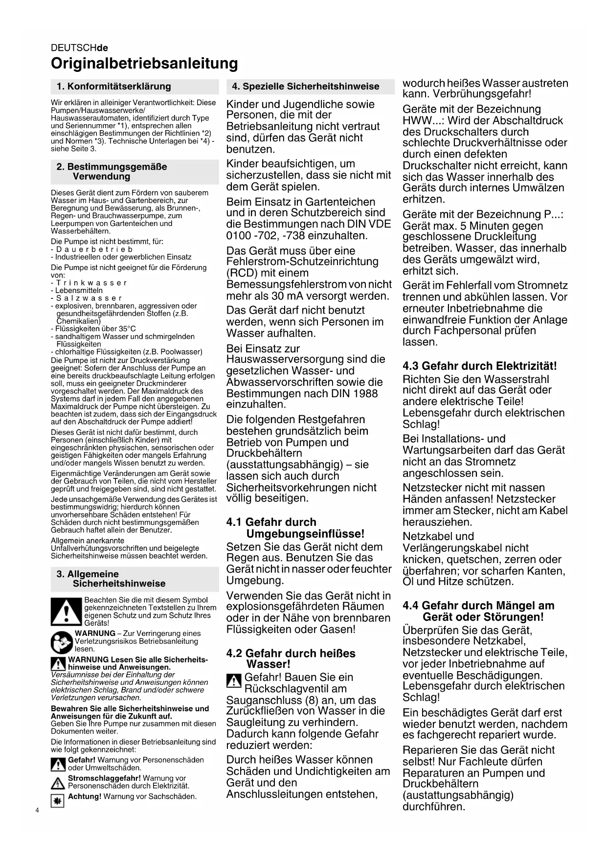 Originalbetriebsanleitung Wir erklären in alleiniger Verantwortlichkeit: Diese Pumpen/Hauswasserwerke/ Hauswasserautomaten, identifiziert durch Type und Seriennummer *1), entsprechen allen einschlägigen Bestimmungen der Richtlinien *2) und Normen *3). Technische Unterlagen bei *4) - siehe Seite 3. Dieses Gerät dient zum Fördern von sauberem Wasser im Haus- und Gartenbereich, zur Beregnung und Bewässerung, als Brunnen-, Regen- und Brauchwasserpumpe, zum Leerpumpen von Gartenteichen und Wasserbehältern. Die Pumpe ist nicht bestimmt, für: -Dauerbetrieb - Industrieellen oder gewerblichen Einsatz Die Pumpe ist nicht geeignet für die Förderung von: -Trinkwasser - Lebensmitteln -Salzwasser - explosiven, brennbaren, aggressiven oder gesundheitsgefährdenden Stoffen (z.B. Chemikalien) - Flüssigkeiten über 35°C - sandhaltigem Wasser und schmirgelnden Flüssigkeiten - chlorhaltige Flüssigkeiten (z.B. Poolwasser) Die Pumpe ist nicht zur Druckverstärkung geeignet: Sofern der Anschluss der Pumpe an eine bereits druckbeaufschlagte Leitung erfolgen soll, muss ein geeigneter Druckminderer vorgeschaltet werden. Der Maximaldruck des Systems darf in jedem Fall den angegebenen Maximaldruck der Pumpe nicht übersteigen. Zu beachten ist zudem, dass sich der Eingangsdruck auf den Abschaltdruck der Pumpe addiert! Dieses Gerät ist nicht dafür bestimmt, durch Personen (einschließlich Kinder) mit eingeschränkten physischen, sensorischen oder geistigen Fähigkeiten oder mangels Erfahrung und/oder mangels Wissen benutzt zu werden. Eigenmächtige Veränderungen am Gerät sowie der Gebrauch von Teilen, die nicht vom Hersteller geprüft und freigegeben sind, sind nicht gestattet. Jede unsachgemäße Verwendung des Gerätes ist bestimmungswidrig; hierdurch können unvorhersehbare Schäden entstehen! Für Schäden durch nicht bestimmungsgemäßen Gebrauch haftet allein der Benutzer. Allgemein anerkannte Unfallverhütungsvorschriften und beigelegte Sicherheitshinweise müssen beachtet werden. Beachten Sie die mit diesem Symbol gekennzeichneten Textstellen zu Ihrem eigenen Schutz und zum Schutz Ihres Geräts! WARNUNG – Zur Verringerung eines Verletzungsrisikos Betriebsanleitung lesen. WARNUNG Lesen Sie alle Sicherheits- hinweise und Anweisungen. Versäumnisse bei der Einhaltung der Sicherheitshinweise und Anweisungen können elektrischen Schlag, Brand und/oder schwere Verletzungen verursachen. Bewahren Sie alle Sicherheitshinweise und Anweisungen für die Zukunft auf. Geben Sie Ihre Pumpe nur zusammen mit diesen Dokumenten weiter. Die Informationen in dieser Betriebsanleitung sind wie folgt gekennzeichnet: Gefahr! Warnung vor Personenschäden oder Umweltschäden. Stromschlaggefahr! Warnung vor Personenschäden durch Elektrizität. Achtung! Warnung vor Sachschäden. Kinder und Jugendliche sowie Personen, die mit der Betriebsanleitung nicht vertraut sind, dürfen das Gerät nicht benutzen. Kinder beaufsichtigen, um sicherzustellen, dass sie nicht mit dem Gerät spielen. Beim Einsatz in Gartenteichen und in deren Schutzbereich sind die Bestimmungen nach DIN VDE 0100 -702, -738 einzuhalten. Das Gerät muss über eine Fehlerstrom-Schutzeinrichtung (RCD) mit einem Bemessungsfehlerstrom von nicht mehr als 30 mA versorgt werden. Das Gerät darf nicht benutzt werden, wenn sich Personen im Wasser aufhalten. Bei Einsatz zur Hauswasserversorgung sind die gesetzlichen Wasser- und Abwasservorschriften sowie die Bestimmungen nach DIN 1988 einzuhalten. Die folgenden Restgefahren bestehen grundsätzlich beim Betrieb von Pumpen und Druckbehältern (ausstattungsabhängig) – sie lassen sich auch durch Sicherheitsvorkehrungen nicht völlig beseitigen.