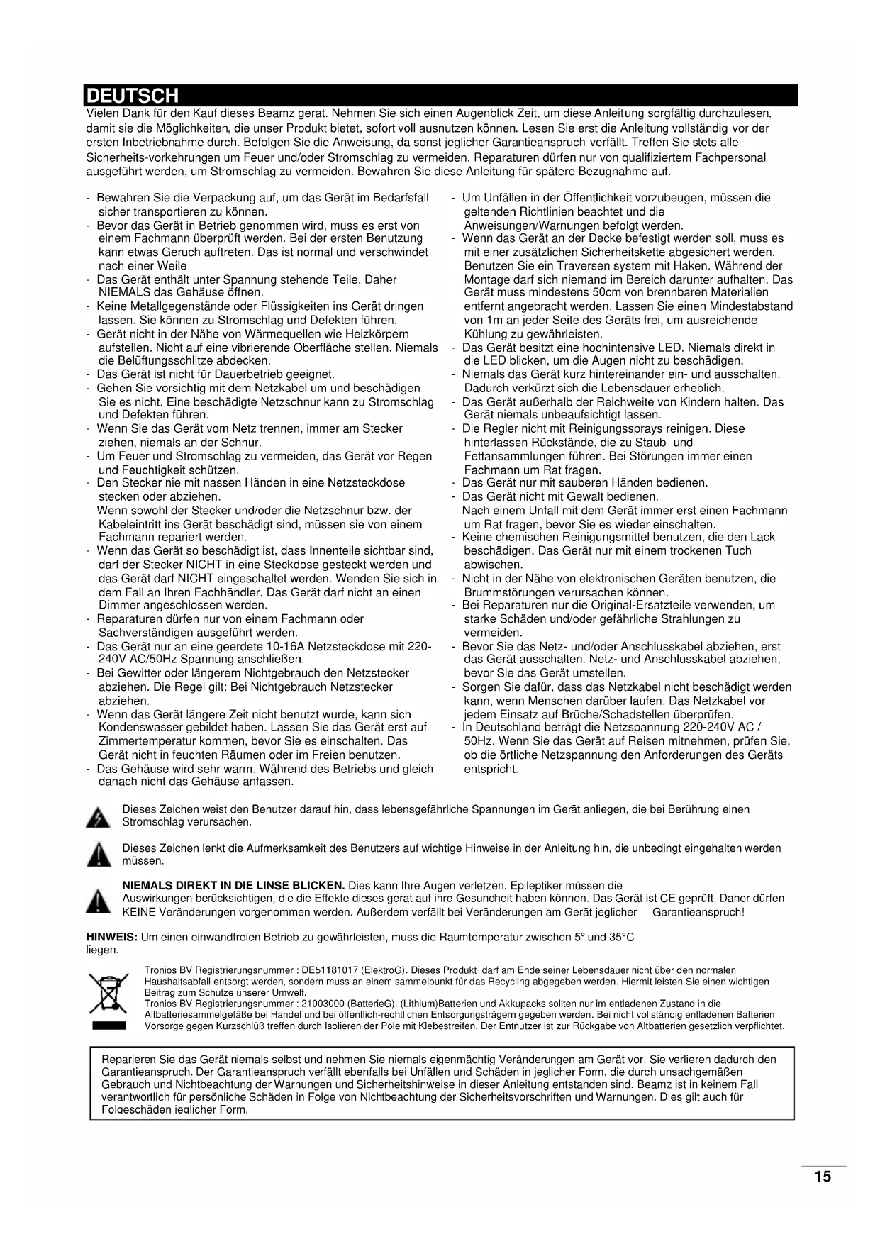 LET OP: Wij adviseren u het reinigen en servicen van het apparaat uit te laten voeren door een vakbekwaam persoon.15 DEUTSCH Vielen Dank für den Kauf dieses Beamz gerat. Nehmen Sie sich einen Augenblick Zeit, um diese Anleitung sorgfältig durchzulesen, damit sie die Möglichkeiten, die unser Produkt bietet, sofort voll ausnutzen können. Lesen Sie erst die Anleitung vollständig vor der ersten Inbetriebnahme durch. Befolgen Sie die Anweisung, da sonst jeglicher Garantieanspruch verfällt. Treffen Sie stets alle Sicherheits-vorkehrungen um Feuer und/oder Stromschlag zu vermeiden. Reparaturen dürfen nur von qualifiziertem Fachpersonal ausgeführt werden, um Stromschlag zu vermeiden. Bewahren Sie diese Anleitung für spätere Bezugnahme auf. - Bewahren Sie die Verpackung auf, um das Gerät im Bedarfsfall sicher transportieren zu können. - Bevor das Gerät in Betrieb genommen wird, muss es erst von einem Fachmann überprüft werden. Bei der ersten Benutzung kann etwas Geruch auftreten. Das ist normal und verschwindet nach einer Weile - Das Gerät enthält unter Spannung stehende Teile. Daher NIEMALS das Gehäuse öffnen. - Keine Metallgegenstände oder Flüssigkeiten ins Gerät dringen lassen. Sie können zu Stromschlag und Defekten führen. - Gerät nicht in der Nähe von Wärmequellen wie Heizkörpern aufstellen. Nicht auf eine vibrierende Oberfläche stellen. Niemals die Belüftungsschlitze abdecken. - Das Gerät ist nicht für Dauerbetrieb geeignet. - Gehen Sie vorsichtig mit dem Netzkabel um und beschädigen Sie es nicht. Eine beschädigte Netzschnur kann zu Stromschlag und Defekten führen. - Wenn Sie das Gerät vom Netz trennen, immer am Stecker ziehen, niemals an der Schnur. - Um Feuer und Stromschlag zu vermeiden, das Gerät vor Regen und Feuchtigkeit schützen. - Den Stecker nie mit nassen Händen in eine Netzsteckdose stecken oder abziehen. - Wenn sowohl der Stecker und/oder die Netzschnur bzw. der Kabeleintritt ins Gerät beschädigt sind, müssen sie von einem Fachmann repariert werden. - Wenn das Gerät so beschädigt ist, dass Innenteile sichtbar sind, darf der Stecker NICHT in eine Steckdose gesteckt werden und das Gerät darf NICHT eingeschaltet werden. Wenden Sie sich in dem Fall an Ihren Fachhändler. Das Gerät darf nicht an einen Dimmer angeschlossen werden. - Reparaturen dürfen nur von einem Fachmann oder Sachverständigen ausgeführt werden. - Das Gerät nur an eine geerdete 10-16A Netzsteckdose mit 220- 240V AC/50Hz Spannung anschließen. - Bei Gewitter oder längerem Nichtgebrauch den Netzstecker abziehen. Die Regel gilt: Bei Nichtgebrauch Netzstecker abziehen. - Wenn das Gerät längere Zeit nicht benutzt wurde, kann sich Kondenswasser gebildet haben. Lassen Sie das Gerät erst auf Zimmertemperatur kommen, bevor Sie es einschalten. Das Gerät nicht in feuchten Räumen oder im Freien benutzen. - Das Gehäuse wird sehr warm. Während des Betriebs und gleich danach nicht das Gehäuse anfassen. - Um Unfällen in der Öffentlichkeit vorzubeugen, müssen die geltenden Richtlinien beachtet und die Anweisungen/Warnungen befolgt werden. - Wenn das Gerät an der Decke befestigt werden soll, muss es mit einer zusätzlichen Sicherheitskette abgesichert werden. Benutzen Sie ein Traversen system mit Haken. Während der Montage darf sich niemand im Bereich darunter aufhalten. Das Gerät muss mindestens 50cm von brennbaren Materialien entfernt angebracht werden. Lassen Sie einen Mindestabstand von 1m an jeder Seite des Geräts frei, um ausreichende Kühlung zu gewährleisten. - Das Gerät besitzt eine hochintensive LED. Niemals direkt in die LED blicken, um die Augen nicht zu beschädigen. - Niemals das Gerät kurz hintereinander ein- und ausschalten. Dadurch verkürzt sich die Lebensdauer erheblich. - Das Gerät außerhalb der Reichweite von Kindern halten. Das Gerät niemals unbeaufsichtigt lassen. - Die Regler nicht mit Reinigungssprays reinigen. Diese hinterlassen Rückstände, die zu Staub- und Fettansammlungen führen. Bei Störungen immer einen Fachmann um Rat fragen. - Das Gerät nur mit sauberen Händen bedienen. - Das Gerät nicht mit Gewalt bedienen. - Nach einem Unfall mit dem Gerät immer erst einen Fachmann um Rat fragen, bevor Sie es wieder einschalten. - Keine chemischen Reinigungsmittel benutzen, die den Lack beschädigen. Das Gerät nur mit einem trockenen Tuch abwischen. - Nicht in der Nähe von elektronischen Geräten benutzen, die Brummstörungen verursachen können. - Bei Reparaturen nur die Original-Ersatzteile verwenden, um starke Schäden und/oder gefährliche Strahlungen zu vermeiden. - Bevor Sie das Netz- und/oder Anschlusskabel abziehen, erst das Gerät ausschalten. Netz- und Anschlusskabel abziehen, bevor Sie das Gerät umstellen. - Sorgen Sie dafür, dass das Netzkabel nicht beschädigt werden kann, wenn Menschen darüber laufen. Das Netzkabel vor jedem Einsatz auf Brüche/Schadstellen überprüfen. - In Deutschland beträgt die Netzspannung 220-240V AC / 50Hz. Wenn Sie das Gerät auf Reisen mitnehmen, prüfen Sie, ob die örtliche Netzspannung den Anforderungen des Geräts entspricht. Dieses Zeichen weist den Benutzer darauf hin, dass lebensgefährliche Spannungen im Gerät anliegen, die bei Berührung einen Stromschlag verursachen. Dieses Zeichen lenkt die Aufmerksamkeit des Benutzers auf wichtige Hinweise in der Anleitung hin, die unbedingt eingehalten werden müssen. NIEMALS DIREKT IN DIE LINSE BLICKEN. Dies kann Ihre Augen verletzen. Epileptiker müssen die Auswirkungen berücksichtigen, die die Effekte dieses gerat auf ihre Gesundheit haben können. Das Gerät ist CE geprüft. Daher dürfen KEINE Veränderungen vorgenommen werden. Außerdem verfällt bei Veränderungen am Gerät jeglicher Garantieanspruch! HINWEIS: Um einen einwandfreien Betrieb zu gewährleisten, muss die Raumtemperatur zwischen 5° und 35°C liegen. Tronios BV Registrierungsnummer : DE51181017 (ElektroG). Dieses Produkt darf am Ende seiner Lebensdauer nicht über den norma