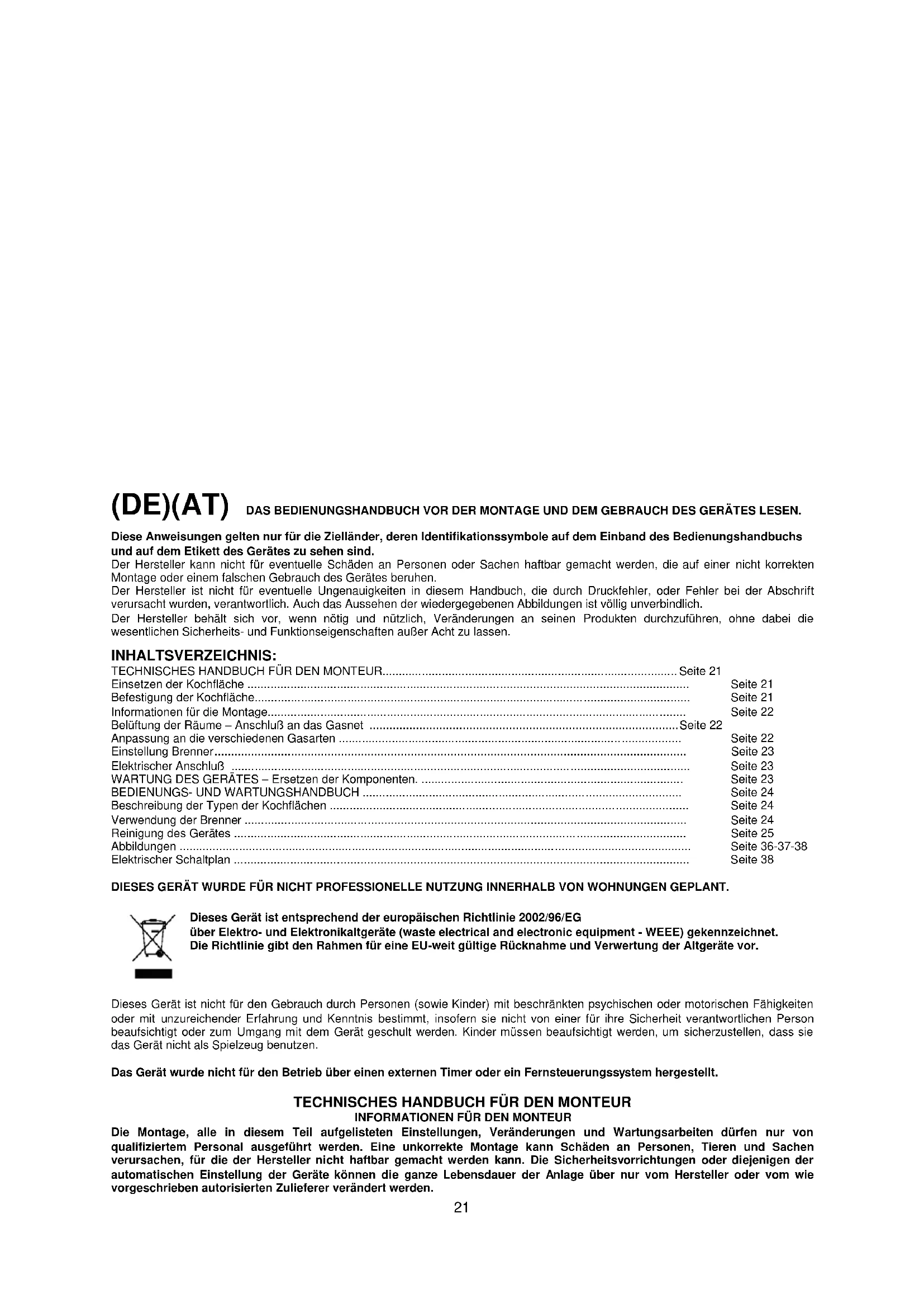 (DE)(AT) DAS BEDIENUNGSHANDBUCH VOR DER MONTAGE UND DEM GEBRAUCH DES GERÄTES LESEN. Diese Anweisungen gelten nur für die Zielländer, deren Identifikationssymbole auf dem Einband des Bedienungshandbuchs und auf dem Etikett des Gerätes zu sehen sind. Der Hersteller kann nicht für eventuelle Schäden an Personen oder Sachen haftbar gemacht werden, die auf einer nicht korrekten Montage oder einem falschen Gebrauch des Gerätes beruhen. Der Hersteller ist nicht für eventuelle Ungenauigkeiten in diesem Handbuch, die durch Druckfehler, oder Fehler bei der Abschrift verursacht wurden, verantwortlich. Auch das Aussehen der wiedergegebenen Abbildungen ist völlig unverbindlich. Der Hersteller behält sich vor, wenn nötig und nützlich, Veränderungen an seinen Produkten durchzuführen, ohne dabei die wesentlichen Sicherheits- und Funktionseigenschaften außer Acht zu lassen. INHALTSVERZEICHNIS: TECHNISCHES HANDBUCH FÜR DEN MONTEUR......................................................................................... Seite 21 Einsetzen der Kochfläche ..................................................................................................................................... Seite 21 Befestigung der Kochfläche................................................................................................................................... Seite 21 Informationen für die Montage.............................................................................................................................. Seite 22 Belüftung der Räume – Anschluß an das Gasnet ............................................................................................. Seite 22 Anpassung an die verschiedenen Gasarten ....................................................................................................... Seite 22 Einstellung Brenner .............................................................................................................................................. Seite 23 Elektrischer Anschluß .......................................................................................................................................... Seite 23 WARTUNG DES GERÄTES – Ersetzen der Komponenten................................................................................. Seite 23 BEDIENUNGS- UND WARTUNGSHANDBUCH ................................................................................................ Seite 24 Beschreibung der Typen der Kochflächen ............................................................................................................ Seite 24 Verwendung der Brenner ..................................................................................................................................... Seite 24 Reinigung des Gerätes ........................................................................................................................................ Seite 25 Abbildungen .......................................................................................................................................................... Seite 36-37-38 Elektrischer Schaltplan ......................................................................................................................................... Seite 38 DIESES GERÄT WURDE FÜR NICHT PROFESSIONELLE NUTZUNG INNERHALB VON WOHNUNGEN GEPLANT. Dieses Gerät ist entsprechend der europäischen Richtlinie 2002/96/EG über Elektro- und Elektronikaltgeräte (waste electrical and electronic equipment - WEEE) gekennzeichnet. Die Richtlinie gibt den Rahmen für eine EU-weit gültige Rücknahme und Verwertung der Altgeräte vor.