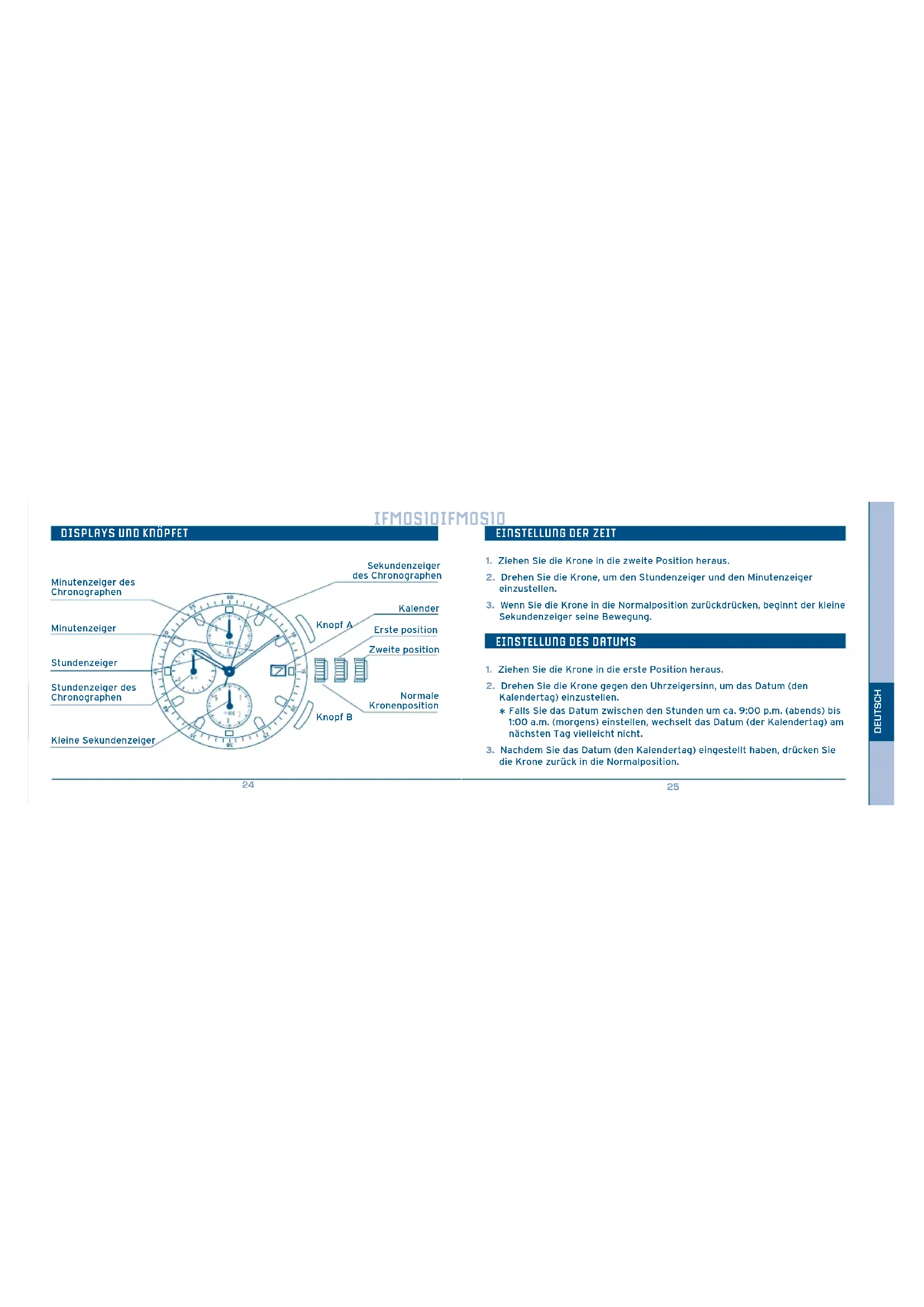 Knopf A Knopf B Minutenzeiger Stundenzeiger Sekundenzeiger des Chronographen Minutenzeiger des Chronographen Stundenzeiger des Chronographen Kleine Sekundenzeiger Erste position Kalender Zweite position Normale Kronenposition