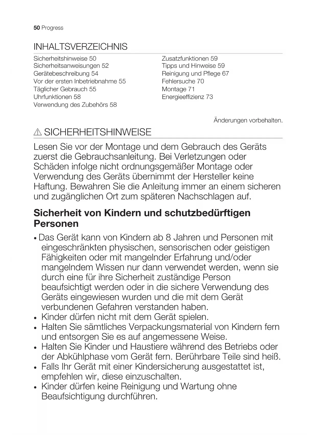 Kinder dürfen keine Reinigung und Wartung ohne Beaufsichtigung durchführen. 50 Progress• Kinder bis zu 3 Jahren sind während des Betriebs unbedingt von dem Gerät fernzuhalten. Allgemeine Sicherheit