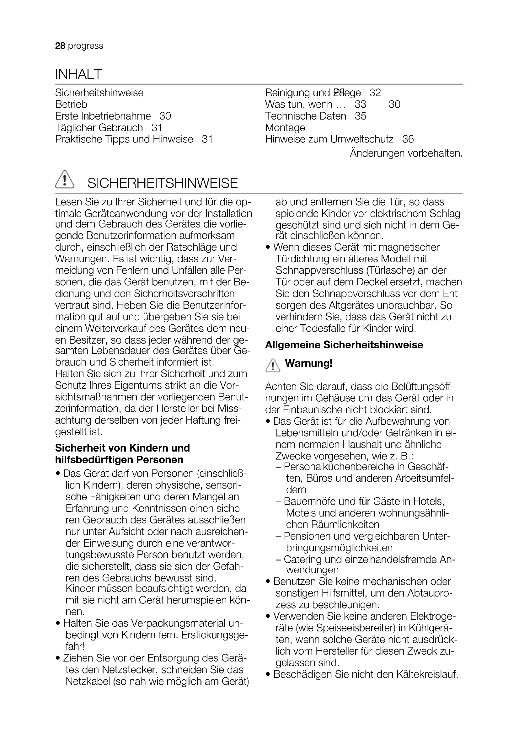 Veillez à garantir une circulation d'air suffi- sante à l'arrière de l'appareil. Important Consultez la notice de montage lors de l'installation. EN MATIÈRE DE SAUVEGARDE DE L'ENVIRONNEMENT Le symbole sur le produit ou son emballage indique que ce produit ne peut être traité comme déchet ménager. Il doit être remis au point de collecte dédié à cet effet (collecte et recyclage du matériel électrique et électronique). En procédant à la mise au rebut de l'appareil dans les règles de l’art, nous préservons l'environnement et notre sécurité, s’assurant ainsi que les déchets seront traités dans des conditions optimum. Pour obtenir plus de détails sur le recyclage de ce produit, veuillez prendre contact avec les services de votre commune ou le magasin où vous avez effectué l'achat. progress 27INHALT Sicherheitshinweise 28 Betrieb 30 Erste Inbetriebnahme 30 Täglicher Gebrauch 31 Praktische Tipps und Hinweise 31 Reinigung und Pflege 32 Was tun, wenn … 33 Technische Daten 35 Montage 35 Hinweise zum Umweltschutz 36 Änderungen vorbehalten. SICHERHEITSHINWEISE Lesen Sie zu Ihrer Sicherheit und für die op- timale Geräteanwendung vor der Installation und dem Gebrauch des Gerätes die vorlie- gende Benutzerinformation aufmerksam durch, einschließlich der Ratschläge und Warnungen. Es ist wichtig, dass zur Ver- meidung von Fehlern und Unfällen alle Per- sonen, die das Gerät benutzen, mit der Be- dienung und den Sicherheitsvorschriften vertraut sind. Heben Sie die Benutzerinfor- mation gut auf und übergeben Sie sie bei einem Weiterverkauf des Gerätes dem neu- en Besitzer, so dass jeder während der ge- samten Lebensdauer des Gerätes über Ge- brauch und Sicherheit informiert ist. Halten Sie sich zu Ihrer Sicherheit und zum Schutz Ihres Eigentums strikt an die Vor- sichtsmaßnahmen der vorliegenden Benut- zerinformation, da der Hersteller bei Miss- achtung derselben von jeder Haftung frei- gestellt ist. Sicherheit von Kindern und hilfsbedürftigen Personen