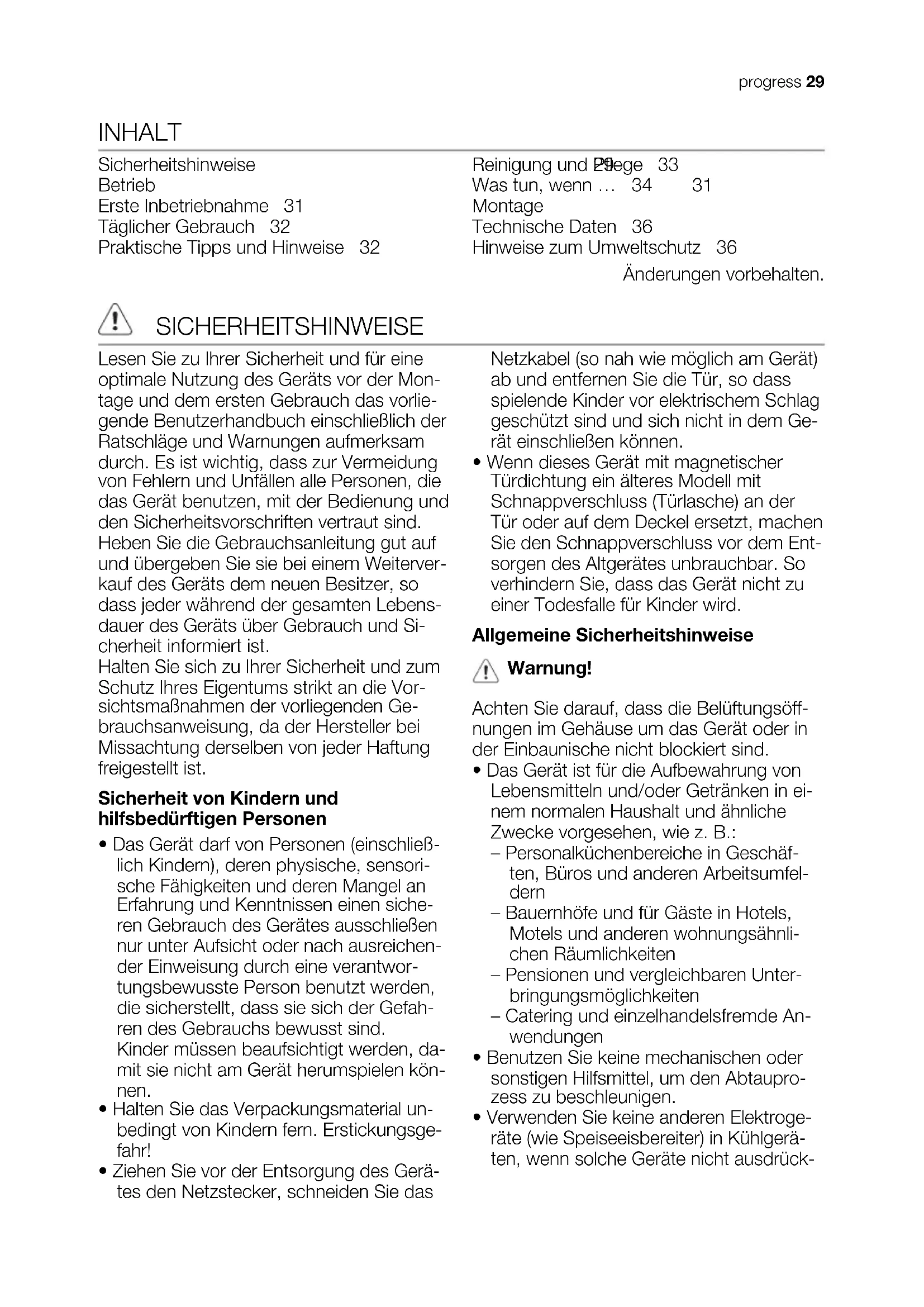 - Verwenden Sie keine anderen Elektroge- räte (wie Speiseeisbereiter) in Kühlgerä- ten, wenn solche Geräte nicht ausdrück- progress 29lich vom Hersteller für diesen Zweck zu- gelassen sind.