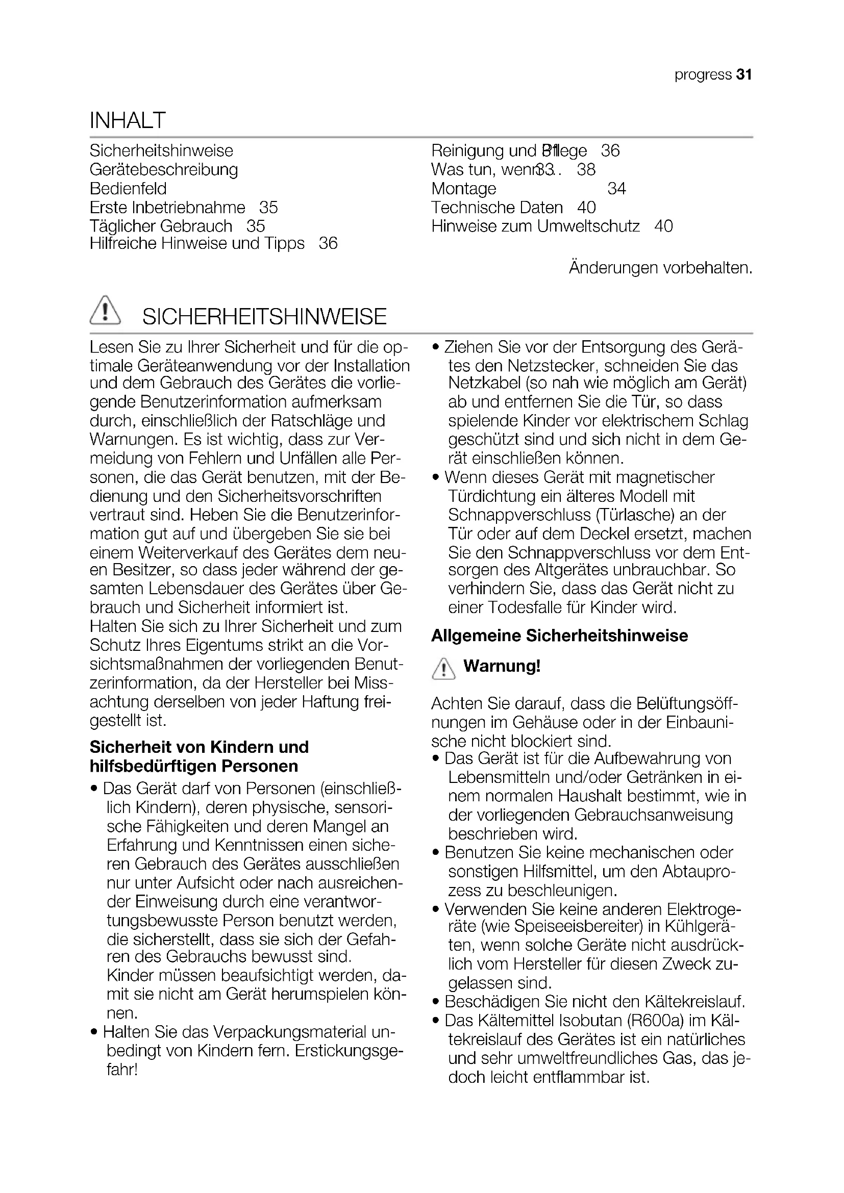 Dimension Hauteur 815 mm Largeur 596 mm Profondeur 550 mm Autonomie de fonctionnement 29 h Tension 230-240 V Fréquence 50 Hz Les caractéristiques techniques figurent sur la plaque signalétique située sur le côté gauche à l'intérieur de l'appareil et sur l'éti- quette énergétique. EN MATIÈRE DE SAUVEGARDE DE L'ENVIRONNEMENT Le symbole sur le produit ou son emballage indique que ce produit ne peut être traité comme déchet ménager. Il doit être remis au point de collecte dédié à cet effet (collecte et recyclage du matériel électrique et électronique). En procédant à la mise au rebut de l'appareil dans les règles de l’art, nous préservons l'environnement et notre sécurité, s’assurant ainsi que les déchets progress 29seront traités dans des conditions optimum. Pour obtenir plus de détails sur le recyclage de ce produit, veuillez prendre contact avec les services de votre commune ou le magasin où vous avez effectué l'achat. 30 progressINHALT Sicherheitshinweise 31 Gerätebeschreibung 33 Bedienfeld 34 Erste Inbetriebnahme 35 Täglicher Gebrauch 35 Hilfreiche Hinweise und Tipps 36 Reinigung und Pflege 36 Was tun, wenn … 38 Montage 39 Technische Daten 40 Hinweise zum Umweltschutz 40 Änderungen vorbehalten. SICHERHEITSHINWEISE Lesen Sie zu Ihrer Sicherheit und für die op- timale Geräteanwendung vor der Installation und dem Gebrauch des Gerätes die vorlie- gende Benutzerinformation aufmerksam durch, einschließlich der Ratschläge und Warnungen. Es ist wichtig, dass zur Ver- meidung von Fehlern und Unfällen alle Per- sonen, die das Gerät benutzen, mit der Be- dienung und den Sicherheitsvorschriften vertraut sind. Heben Sie die Benutzerinfor- mation gut auf und übergeben Sie sie bei einem Weiterverkauf des Gerätes dem neu- en Besitzer, so dass jeder während der ge- samten Lebensdauer des Gerätes über Ge- brauch und Sicherheit informiert ist. Halten Sie sich zu Ihrer Sicherheit und zum Schutz Ihres Eigentums strikt an die Vor- sichtsmaßnahmen der vorliegenden Benut- zerinformation, da der Hersteller bei Miss- achtung derselben von jeder Haftung frei- gestellt ist. Sicherheit von Kindern und hilfsbedürftigen Personen
