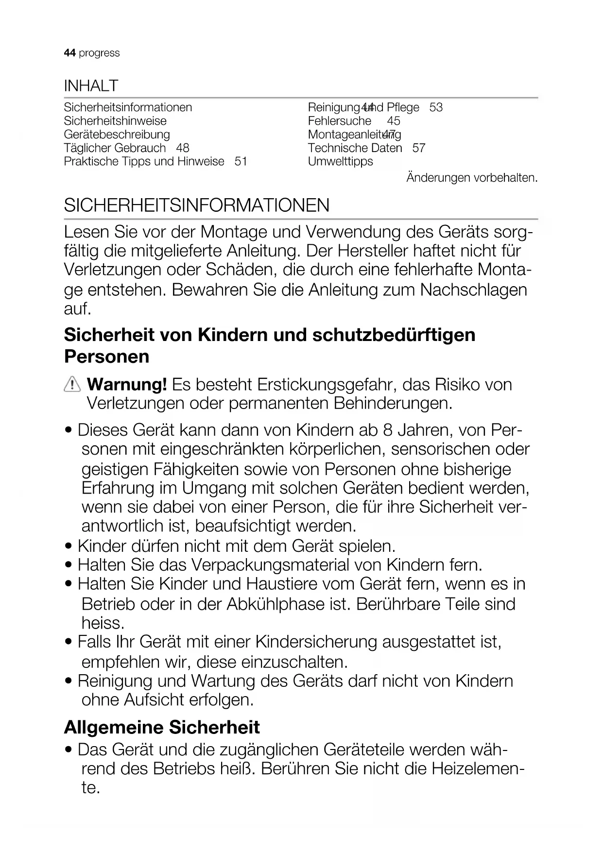 - Das Gerät und die zugänglichen Geräteteile werden wäh- rend des Betriebs heiß. Berühren Sie nicht die Heizelemen- te. 44 progress• Schalten Sie das Gerät nicht über eine externe Zeitschaltuhr oder eine separate Fernsteuerung ein.