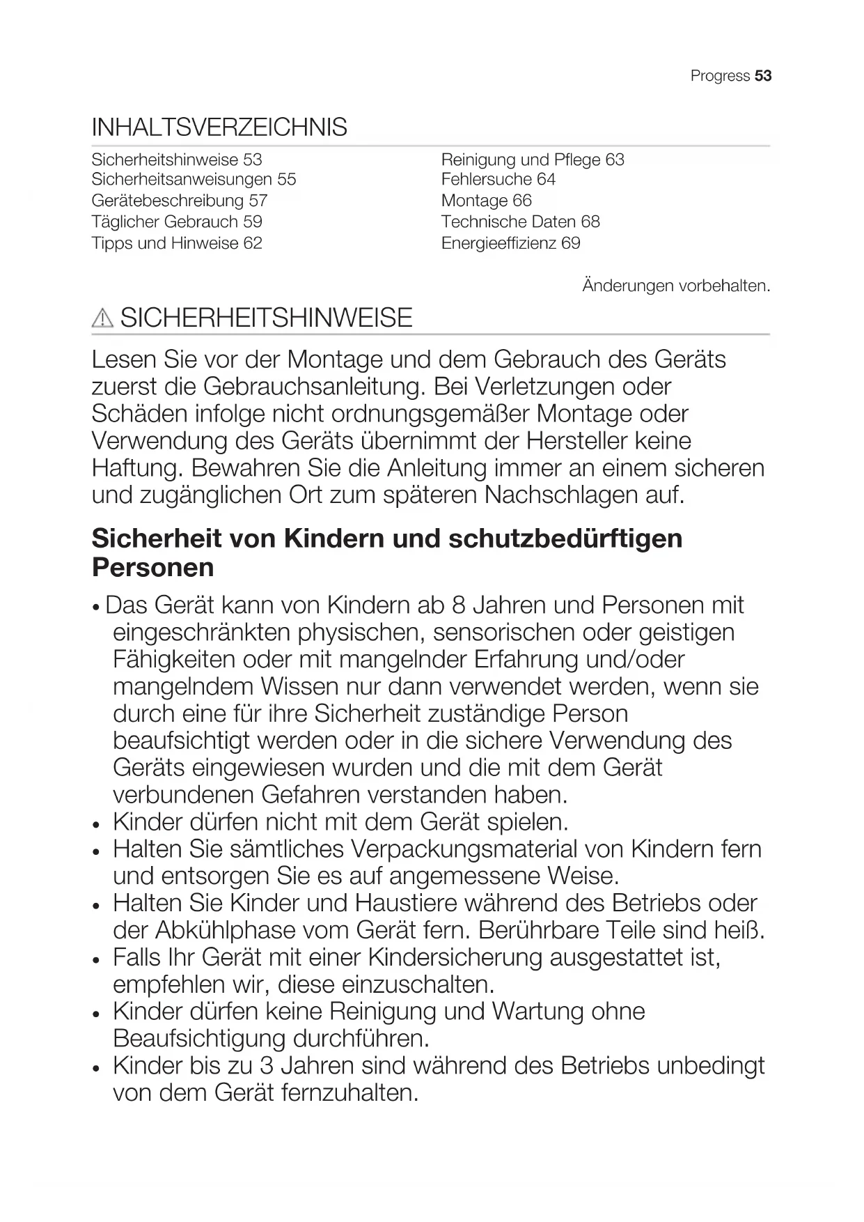 - Vous pouvez utiliser la chaleur résiduelle pour conserver les aliments au chaud ou pour faire fondre. EN MATIÈRE DE PROTECTION DE L'ENVIRONNEMENT Recyclez les matériaux portant le symbole . Déposez les emballages dans les conteneurs prévus à cet effet. Contribuez à la protection de l'environnement et à votre sécurité, recyclez vos produits électriques et électroniques. Ne jetez pas les appareils portant le symbole avec les ordures ménagères. Emmenez un tel produit dans votre centre local de recyclage ou contactez vos services municipaux. 52 ProgressINHALTSVERZEICHNIS Sicherheitshinweise 53 Sicherheitsanweisungen 55 Gerätebeschreibung 57 Täglicher Gebrauch 59 Tipps und Hinweise 62 Reinigung und Pflege 63 Fehlersuche 64 Montage 66 Technische Daten 68 Energieeffizienz 69 Änderungen vorbehalten. SICHERHEITSHINWEISE Lesen Sie vor der Montage und dem Gebrauch des Geräts zuerst die Gebrauchsanleitung. Bei Verletzungen oder Schäden infolge nicht ordnungsgemäßer Montage oder Verwendung des Geräts übernimmt der Hersteller keine Haftung. Bewahren Sie die Anleitung immer an einem sicheren und zugänglichen Ort zum späteren Nachschlagen auf. Sicherheit von Kindern und schutzbedürftigen Personen