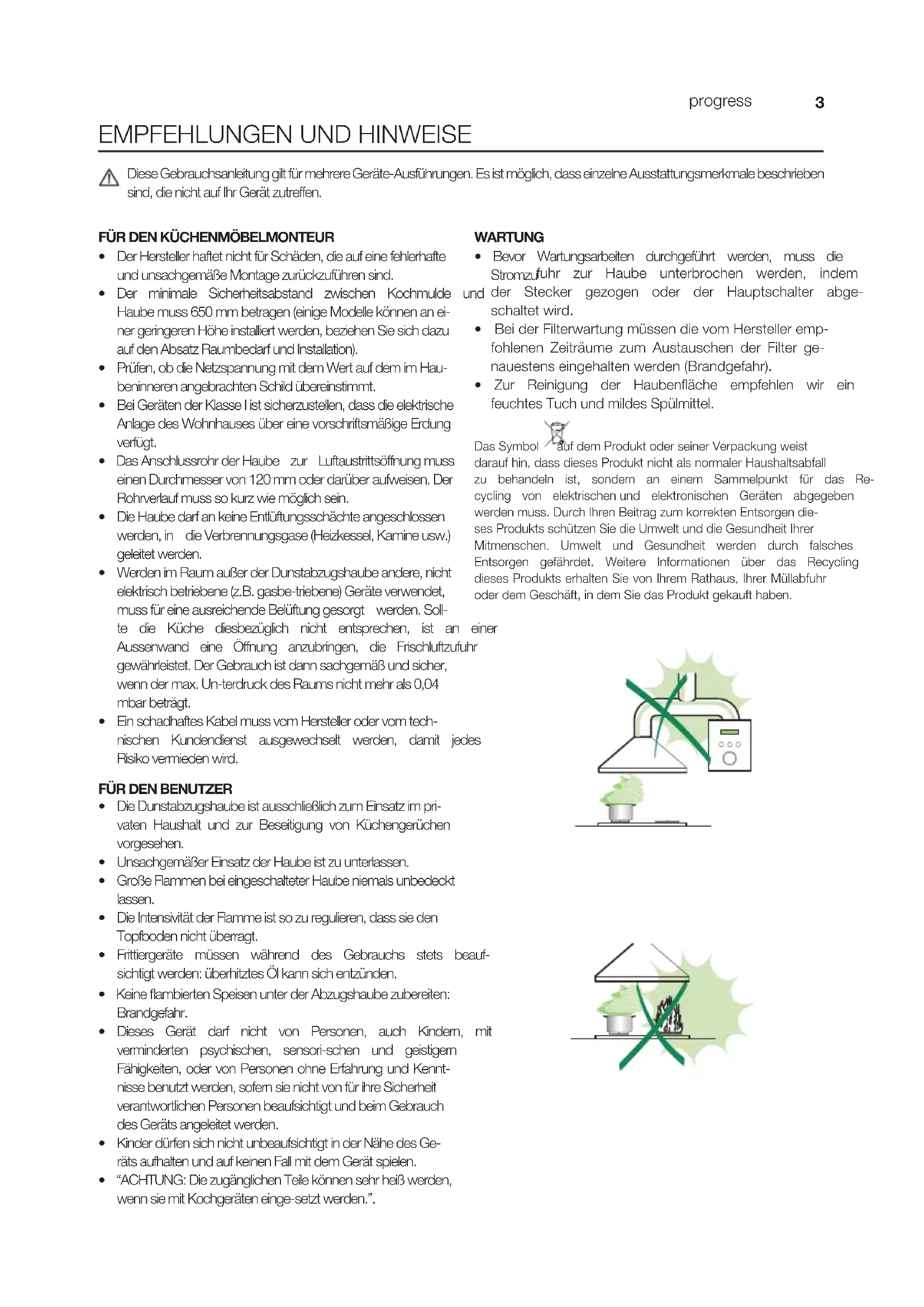 - Zur Reinigung der Haubenäche empfehlen wir ein feuchtesTuchundmildesSpülmittel. DasSymbol aufdemProduktoderseinerVerpackungweistdarauf hin, dass dieses Produkt nicht als normaler Haushaltsabfall zu behandeln ist, sondern an einem Sammelpunkt für das Re-cycling von elektrischenund elektronischen Geräten abgegebenwerdenmuss.DurchIhrenBeitragzumkorrektenEntsorgendie-sesProduktsschützenSiedieUmweltunddieGesundheitIhrerMitmenschen. Umwelt und Gesundheit werden durch falschesEntsorgen gefährdet. Weitere Informationen über das Recyclingdieses Produkts erhalten Sie von Ihrem Rathaus, Ihrer Müllabfuhr oder dem Geschäft, in dem Sie das Produkt gekauft haben.4 progress CHARAKTERISTIKEN Platzbedarf Komponenten Pos. St. Produktkomponenten 1 1 HaubenkörpermitSchaltern,Be- leuchtung,Gebläse-gruppe,Filter 8 1 Luftleitgitter Luftaustritt 10a 1 Flansch ø 120 mm 20 1 Abdeckprol Pos. St. Montagekomponenten 12a4 Schrauben3,5x16 12e2 Schrauben2,9x12,7 12f3 Schrauben2,9x9,5 St. Dokumentation 1 Bedienungsanleitung