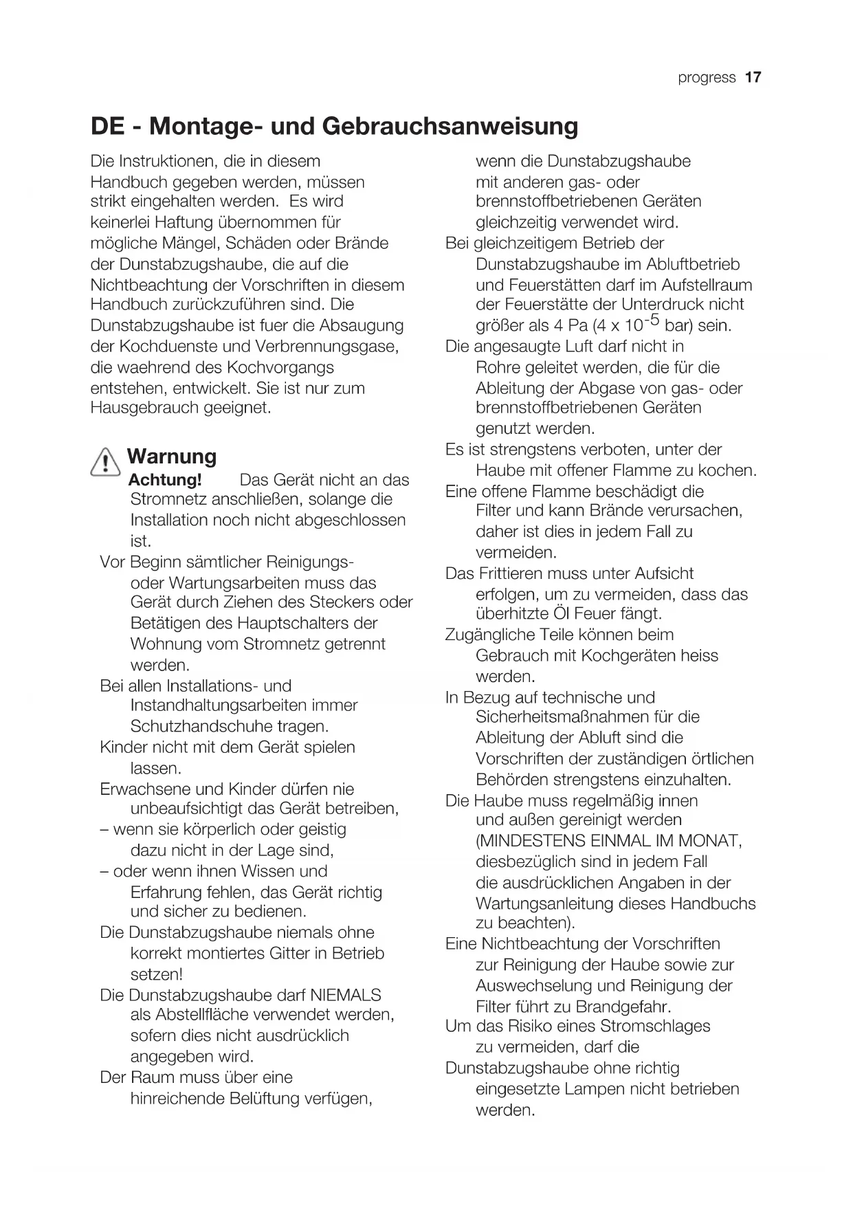 bar) sein. Die angesaugte Luft darf nicht in Rohre geleitet werden, die für die Ableitung der Abgase von gas- oder brennstoffbetriebenen Geräten genutzt werden. Es ist strengstens verboten, unter der Haube mit offener Flamme zu kochen. Eine offene Flamme beschädigt die Filter und kann Brände verursachen, daher ist dies in jedem Fall zu vermeiden. Das Frittieren muss unter Aufsicht erfolgen, um zu vermeiden, dass das überhitzte Öl Feuer fängt. Zugängliche Teile können beim Gebrauch mit Kochgeräten heiss werden. In Bezug auf technische und Sicherheitsmaßnahmen für die Ableitung der Abluft sind die Vorschriften der zuständigen örtlichen Behörden strengstens einzuhalten. Die Haube muss regelmäßig innen und außen gereinigt werden (MINDESTENS EINMAL IM MONAT, diesbezüglich sind in jedem Fall die ausdrücklichen Angaben in der Wartungsanleitung dieses Handbuchs zu beachten). Eine Nichtbeachtung der Vorschriften zur Reinigung der Haube sowie zur Auswechselung und Reinigung der Filter führt zu Brandgefahr. Um das Risiko eines Stromschlages zu vermeiden, darf die Dunstabzugshaube ohne richtig eingesetzte Lampen nicht betrieben werden.18 progress Es wird keinerlei Haftung übernommen für Fehler, Schäden oder Brände des Gerätes, die durch Nichteinhaltung der in diesem Handbuch aufgeführten Anweisungen verschuldet wurden. In Übereinstimmung mit den An- forderungen der Europäischen Rich- tlinie 2002/96/EG über Elektro- und Elektronik-Altgeräte (WEEE) ist vorlieg- endes Gerät mit einer Kennzeichnung versehen. Sie leisten einen positiven Beitrag für den Schutz der Umwelt und die Gesundheit des Menschen, wenn Sie dieses Gerät einer gesonderten Abfallsammlung zuführen. Im un- sortierten Siedlungsmüll könnte ein solches Gerät durch unsachgemäße Entsorgung negative Konsequenzen nach sich ziehen. Auf dem Produkt oder der beilieg- enden Produktdokumentation ist folgendes Symbol einer durch- gestrichenen Abfalltonne abgebil- det. Es weist darauf hin, dass eine Entsorgung im normalen Haush- altsabfall nicht zulässig ist. Entsorgen Sie dieses Produkt im Recyclinghof mit einer getrennten Sammlung für Elektro- und Elektronikgeräte. Die Entsorgung muss gemäß den örtli- chen Bestimmungen zur Abfallbeseiti- gung erfolgen. Bitte wenden Sie sich an die zuständigen Behörden Ihrer Gemeindeverwaltung, an den lokalen Recyclinghof für Haushaltsmüll oder an den Händler, bei dem Sie dieses Gerät erworben haben, um weitere Informationen über Behandlung, Verwertung und Wiederverwendung dieses Produkts zu erhalten. Betriebsart Die Haube kann sowohl als Abluftgërat als auch als Umluftgërat einge- setzt werden. Befestigung Aufgrund des schweren Gewichtes sind mindestens zwei oder noch mehr Personen zur Beförderung und Installation der Abzugshaube erforderlich. Der Abstand zwischen der Abstellfl äche auf dem Kochfeld und der Unterseite der Dunstabzugshaube darf 50cm im Fall von elektrischen Kochfeldern und 65cm im Fall von Gas- oder kombinierten Herden nicht unterschreiten. Wenn die Installationsanweisungen des Gaskochgeräts einen größeren Abstand vorgeben, ist dieser zu berücksichtigen. Die Netzspannung muss der Spannung entsprechen, die auf dem Betriebsdaten- schild im Innern der Haube angegeben ist. Sofern die Haube einen Netzstecker hat, ist dieser an zugänglicher Stelle an eine den geltenden Vorschriften entsprechende Steckdose auch nach der Montage anzuschließen. Bei einer Haube ohne Stecker (direkter Netzanschluss) oder falls der Stecker nicht zugänglich ist, ist ein normgerechter zweipoliger Schalter auch nach der Montage anzubringen, der unter Umständen der Überspannung Kategorie III entsprechend den Installationsregeln ein vollständiges Trennen vom Netz garantiert. Hinweis! Vor der Inbetriebnahme muss sichergestellt sein, dass die Netzversorgung (Steckdose) ordnungsgemäß montiert wurde.progress 19 Betrieb Die Dunstabzugshaube ist mit einer Bedienungsblende ausgestattet, die mit einer Steuerung für die Ansaugstärke bzw. -geschwindigkeit, sowie einer Steuerung zur Einstellung der Arbeitsplatzbeleuchtung versehen ist. 1 2-3