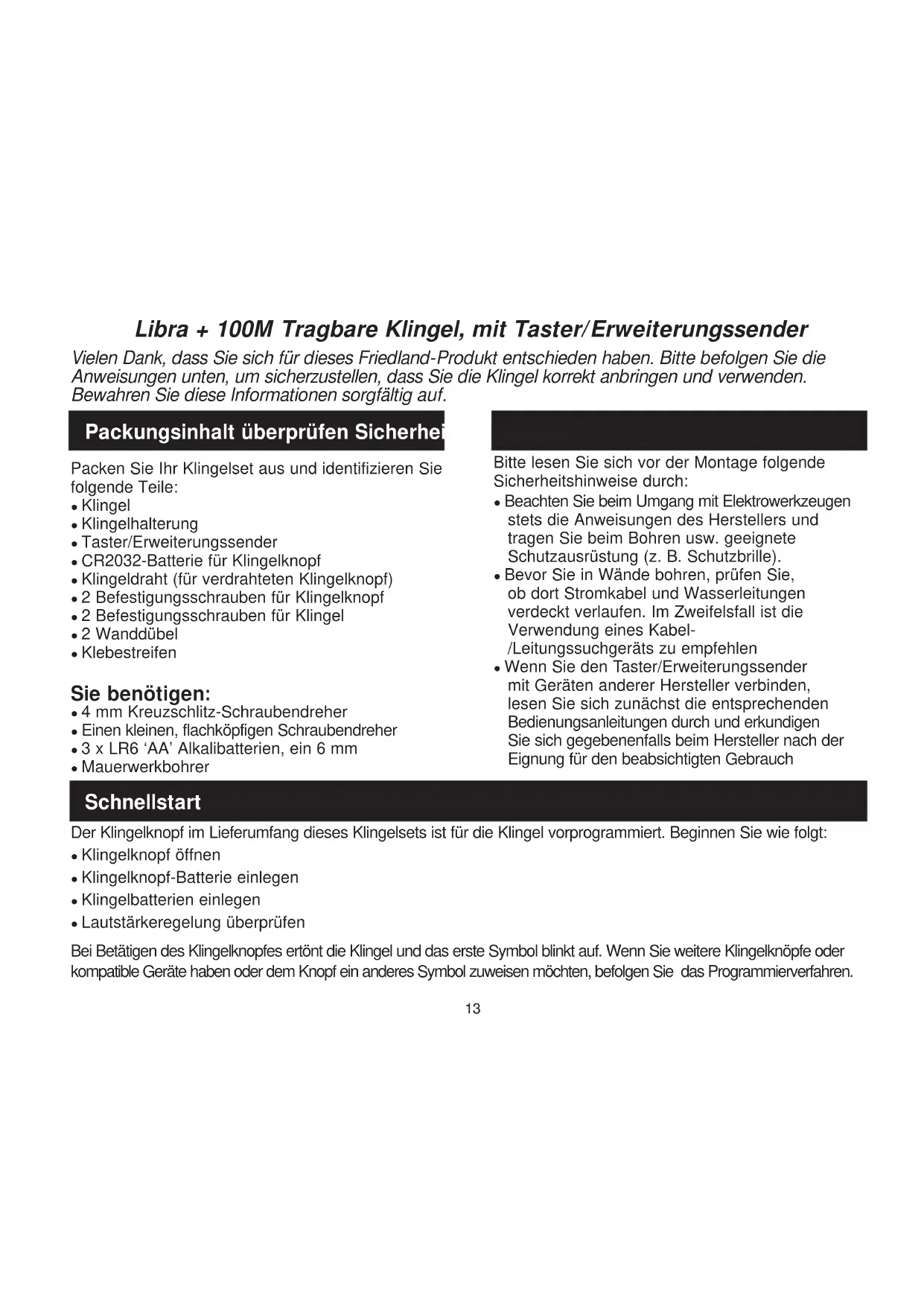 Packungsinhalt überprüfen.................................Pg. 13 Sicherheit............................................................ Schnellstart......................................................... Klingelknopf öffnen/Namensschild herausnehmen.. Pg. 14 Klingelknopfbatterie einlegen............................. Klingelbatterien einlegen.................................... Klingelfunktionen ............................................... Pg. 15 Lautstärke ......................................................... Schiebefenster .................................................. Symbol .............................................................. Pg. 16 Programmierung ............................................... Wiederholung..................................................... Pg. 17 Klingeltöne ........................................................ Anbringen des Klingelknopfes .......................... Gongposition ..................................................... Taster- /Erweiterungssenderfunktionen ............ Pg. 18 Störungssuche .................................................. Pg. 19 Typische Installation .......................................... Pg. 20 Spezifikationen................................................... Pg. 22 Entsorgung......................................................... Garantie............................................................. Erklärung............................................................13 Libra + 100M Tragbare Klingel, mit Taster/Erweiterungssender Vielen Dank, dass Sie sich für dieses Friedland-Produkt entschieden haben. Bitte befolgen Sie die Anweisungen unten, um sicherzustellen, dass Sie die Klingel korrekt anbringen und verwenden. Bewahren Sie diese Informationen sorgfältig auf. Packen Sie Ihr Klingelset aus und identifizieren Sie folgende Teile: ● Klingel● Klingelhalterung● Taster/Erweiterungssender● CR2032-Batterie für Klingelknopf● Klingeldraht (für verdrahteten Klingelknopf)● 2 Befestigungsschrauben für Klingelknopf● 2 Befestigungsschrauben für Klingel● 2 Wanddübel● Klebestreifen Sie benötigen: ● 4 mm Kreuzschlitz-Schraubendreher ● Einen kleinen, flachköpfigen Schraubendreher● 3 x LR6 ‘AA’ Alkalibatterien, ein 6 mm ● Mauerwerkbohrer Packungsinhalt überprüfen Sicherheit Bitte lesen Sie sich vor der Montage folgende Sicherheitshinweise durch: ● Beachten Sie beim Umgang mit Elektrowerkzeugen stets die Anweisungen des Herstellers und tragen Sie beim Bohren usw. geeignete Schutzausrüstung (z. B. Schutzbrille). ● Bevor Sie in Wände bohren, prüfen Sie, ob dort Stromkabel und Wasserleitungen verdeckt verlaufen. Im Zweifelsfall ist die Verwendung eines Kabel- /Leitungssuchgeräts zu empfehlen ● Wenn Sie den Taster/Erweiterungssender mit Geräten anderer Hersteller verbinden, lesen Sie sich zunächst die entsprechenden Bedienungsanleitungen durch und erkundigen Sie sich gegebenenfalls beim Hersteller nach der Eignung für den beabsichtigten Gebrauch Der Klingelknopf im Lieferumfang dieses Klingelsets ist für die Klingel vorprogrammiert. Beginnen Sie wie folgt: ● Klingelknopf öffnen● Klingelknopf-Batterie einlegen ● Klingelbatterien einlegen ● Lautstärkeregelung überprüfen Bei Betätigen des Klingelknopfes ertönt die Klingel und das erste Symbol blinkt auf. Wenn Sie weitere Klingelknöpfe oder kompatible Geräte haben oder dem Knopf ein anderes Symbol zuweisen möchten, befolgen Sie das Programmierverfahren. Schnellstart14 Legen Sie die CR2032-Knopfbatterie ein. Die mit ‚+‘ gekennzeichnete Seite weist dabei nach oben. Klingelknopfbatterie einlegen Abb. 2 CR2032