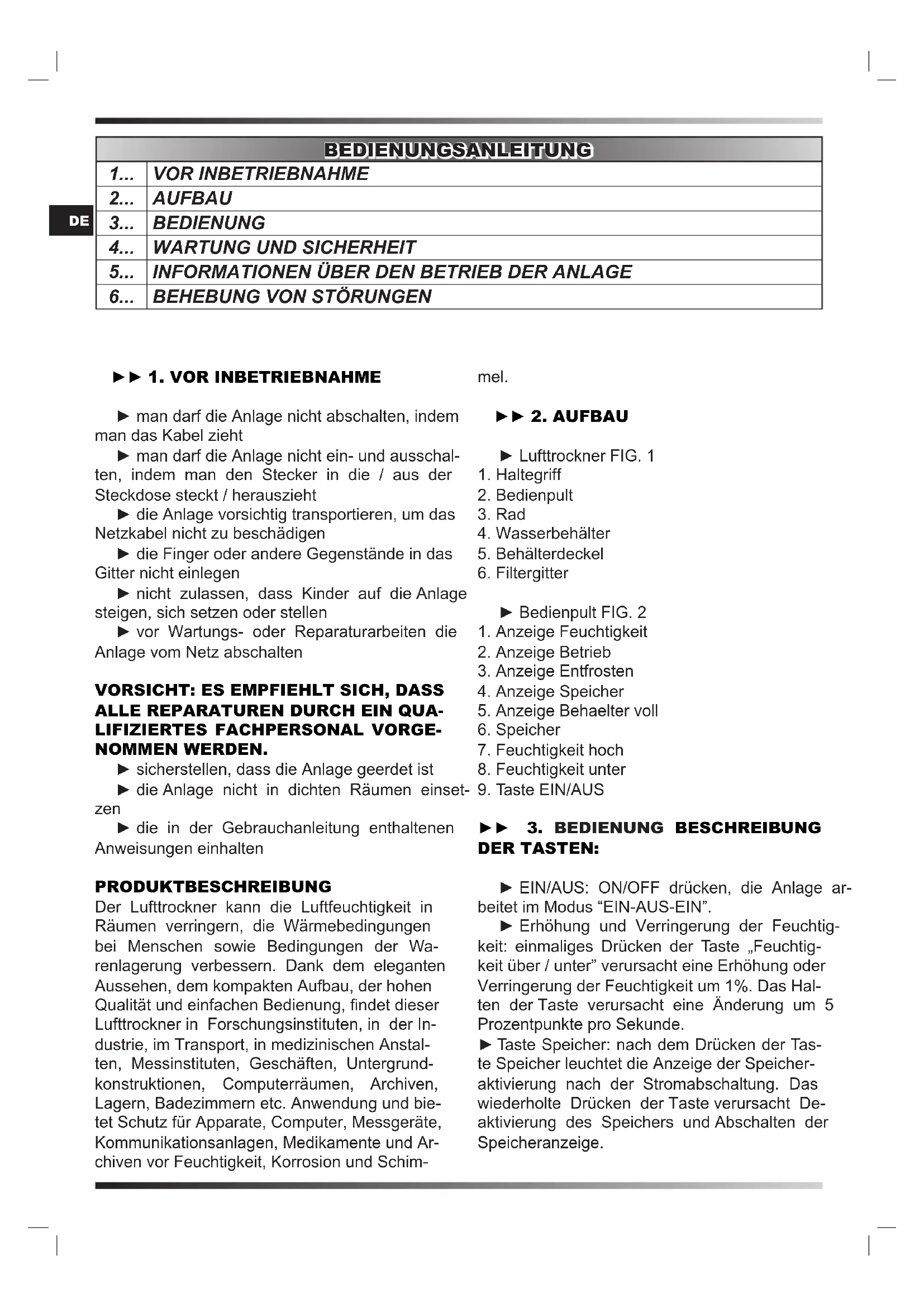 NOMMEN wERDEN. ► sicherstellen, dass die Anlage geerdet ist ► die Anlage nicht in dichten Räumen einset- zen ► die in der Gebrauchanleitung enthaltenen Anweisungen einhalten PRODUKTBESCHREIBUNG Der Lufttrockner kann die Luftfeuchtigkeit in Räumen verringern, die Wärmebedingungen bei Menschen sowie Bedingungen der Wa- renlagerung verbessern. Dank dem eleganten Aussehen, dem kompakten Aufbau, der hohen Qualität und einfachen Bedienung, ndet dieser Lufttrockner in Forschungsinstituten, in der In- dustrie, im Transport, in medizinischen Anstal- ten, Messinstituten, Geschäften, Untergrund- konstruktionen, Computerräumen, Archiven, Lagern, Badezimmern etc. Anwendung und bie- tet Schutz für Apparate, Computer, Messgeräte, Kommunikationsanlagen, Medikamente und Ar- chiven vor Feuchtigkeit, Korrosion und Schim- mel. ► 2. AUFBAU ► Lufttrockner FIG. 1