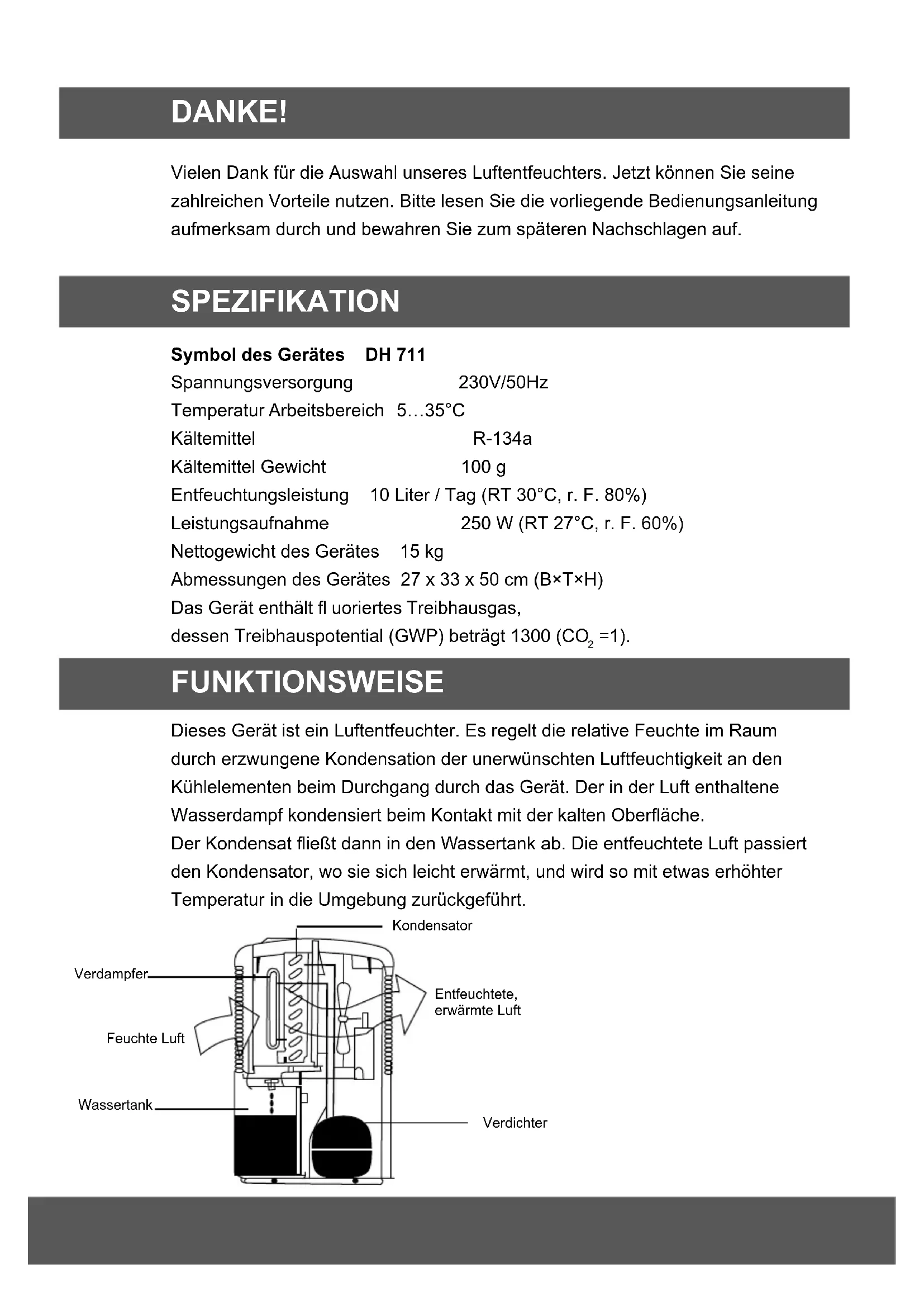 - Není přístroj postaven na nerovném místě? NIKDY SE NEPOKOUŠEJTE PŘÍSTROJ SAMI OPRAVOVAT.KondensatorVerdampferFeuchte LuftEntfeuchtete, erwärmte LuftWassertankVerdichter DANKE! Vielen Dank für die Auswahl unseres Luftentfeuchters. Jetzt können Sie seine zahlreichen Vorteile nutzen. Bitte lesen Sie die vorliegende Bedienungsanleitung aufmerksam durch und bewahren Sie zum späteren Nachschlagen auf. SPEZIFIKATION Symbol des Gerätes DH 711 Spannungsversorgung 230V/50Hz Temperatur Arbeitsbereich 5…35°C Kältemittel R-134a Kältemittel Gewicht Entfeuchtungsleistung 10 Liter / Tag (RT 30°C, r. F. 80%) Leistungsaufnahme Nettogewicht des Gerätes 15 kg Abmessungen des Gerätes 27 x 33 x 50 cm (B×T×H) FUNKTIONSWEISE Dieses Gerät ist ein Luftentfeuchter. Es regelt die relative Feuchte im Raum durch erzwungene Kondensation der unerwünschten Luftfeuchtigkeit an den Kühlelementen beim Durchgang durch das Gerät. Der in der Luft enthaltene Wasserdampf kondensiert beim Kontakt mit der kalten Oberfläche. Der Kondensat fließt dann in den Wassertank ab. Die entfeuchtete Luft passiert den Kondensator, wo sie sich leicht erwärmt, und wird so mit etwas erhöhter Temperatur in die Umgebung zurückgeführt. 100 g 250 W (RT 27°C, r. F. 60%)