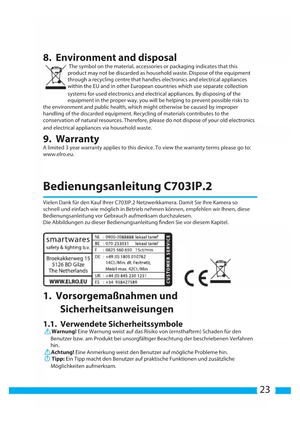 A limited 3 year warranty applies to this device. To view the warranty terms please go to: www.elro.eu. Bedienungsanleitung C703IP.2 Vielen Dank für den Kauf Ihrer C703IP.2 Netzwerkkamera. Damit Sie Ihre Kamera so schnell und einfach wie möglich in Betrieb nehmen können, empfehlen wir Ihnen, diese Bedienungsanleitung vor Gebrauch aufmerksam durchzulesen. Die Abbildungen zu dieser Bedienungsanleitung nden Sie vor diesem Kapitel.