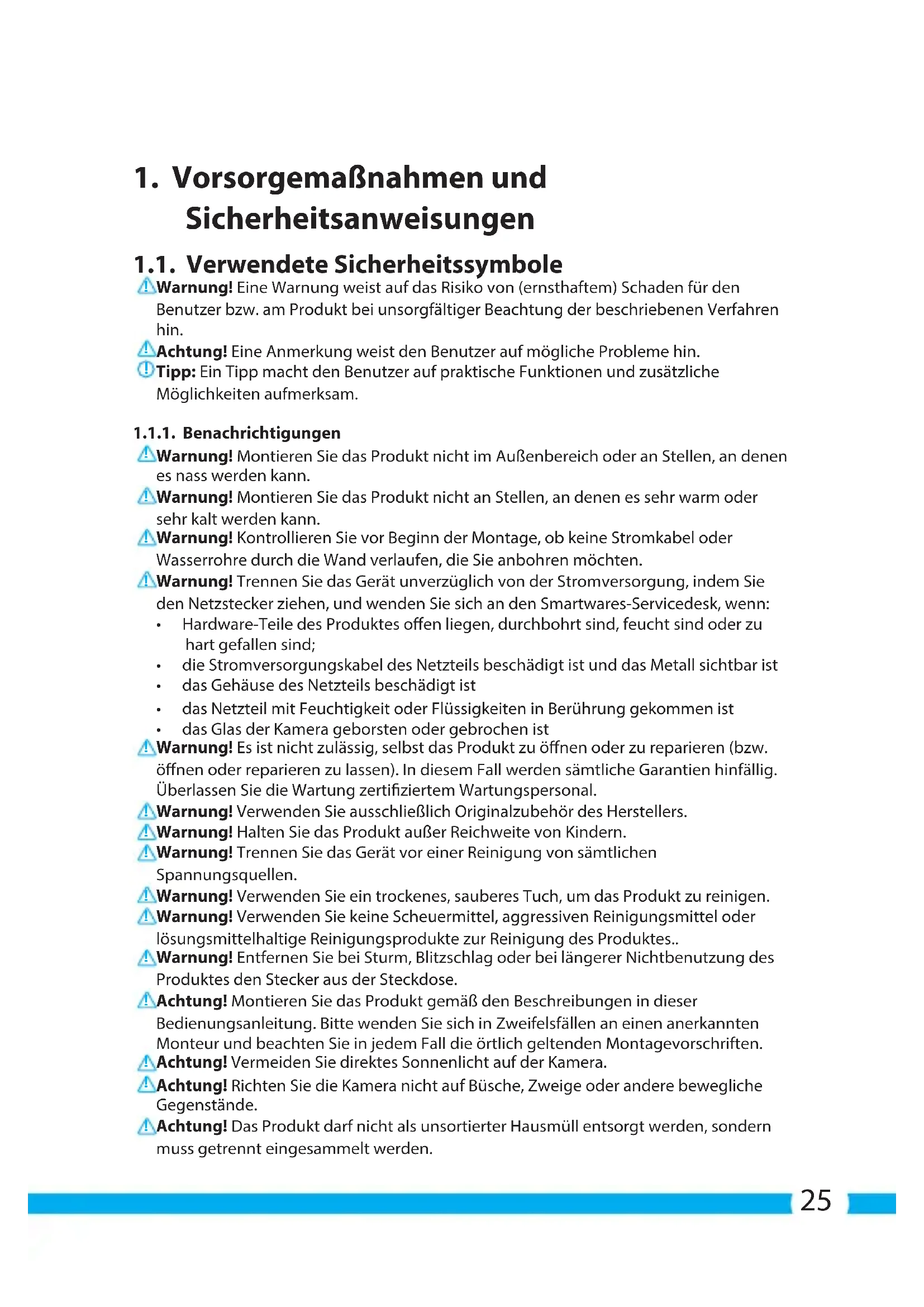Warnung! Trennen Sie das Gerät unverzüglich von der Stromversorgung, indem Sie den Netzstecker ziehen, und wenden Sie sich an den Smartwares-Servicedesk, wenn: