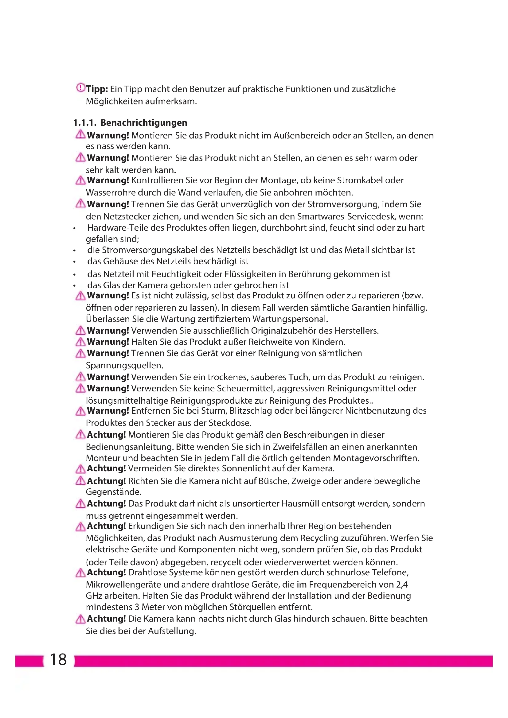 - das Glas der Kamera geborsten oder gebrochen ist Warnung! Es ist nicht zulässig, selbst das Produkt zu önen oder zu reparieren (bzw. önen oder reparieren zu lassen). In diesem Fall werden sämtliche Garantien hinfällig. Überlassen Sie die Wartung zertiziertem Wartungspersonal. Warnung! Verwenden Sie ausschließlich Originalzubehör des Herstellers. Warnung! Halten Sie das Produkt außer Reichweite von Kindern. Warnung! Trennen Sie das Gerät vor einer Reinigung von sämtlichen Spannungsquellen. Warnung! Verwenden Sie ein trockenes, sauberes Tuch, um das Produkt zu reinigen. Warnung! Verwenden Sie keine Scheuermittel, aggressiven Reinigungsmittel oder lösungsmittelhaltige Reinigungsprodukte zur Reinigung des Produktes.. Warnung! Entfernen Sie bei Sturm, Blitzschlag oder bei längerer Nichtbenutzung des Produktes den Stecker aus der Steckdose. Achtung! Montieren Sie das Produkt gemäß den Beschreibungen in dieser Bedienungsanleitung. Bitte wenden Sie sich in Zweifelsfällen an einen anerkannten Monteur und beachten Sie in jedem Fall die örtlich geltenden Montagevorschriften. Achtung! Vermeiden Sie direktes Sonnenlicht auf der Kamera. Achtung! Richten Sie die Kamera nicht auf Büsche, Zweige oder andere bewegliche Gegenstände. Achtung! Das Produkt darf nicht als unsortierter Hausmüll entsorgt werden, sondern muss getrennt eingesammelt werden. Achtung! Erkundigen Sie sich nach den innerhalb Ihrer Region bestehenden Möglichkeiten, das Produkt nach Ausmusterung dem Recycling zuzuführen. Werfen Sie elektrische Geräte und Komponenten nicht weg, sondern prüfen Sie, ob das Produkt (oder Teile davon) abgegeben, recycelt oder wiederverwertet werden können. Achtung! Drahtlose Systeme können gestört werden durch schnurlose Telefone, Mikrowellengeräte und andere drahtlose Geräte, die im Frequenzbereich von 2,4 GHz arbeiten. Halten Sie das Produkt während der Installation und der Bedienung mindestens 3 Meter von möglichen Störquellen entfernt. Achtung! Die Kamera kann nachts nicht durch Glas hindurch schauen. Bitte beachten Sie dies bei der Aufstellung.19