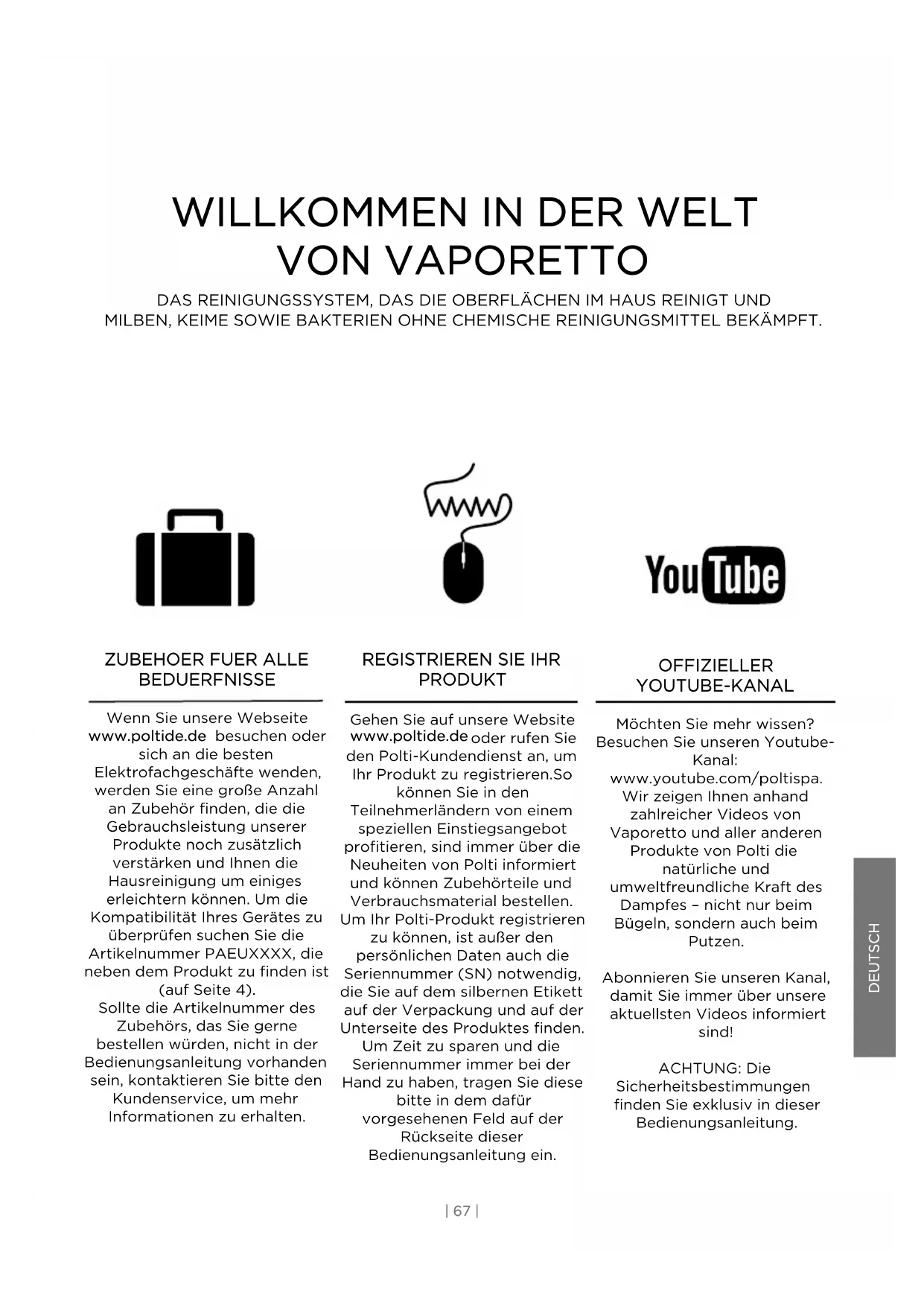PRODUKT Gehen Sie auf unsere Website www.poltide.de oder rufen Sie den Polti-Kundendienst an, um Ihr Produkt zu registrieren.So können Sie in den Teilnehmerländern von einem speziellen Einstiegsangebot profitieren, sind immer über die Neuheiten von Polti informiert und können Zubehörteile und Verbrauchsmaterial bestellen. Um Ihr Polti-Produkt registrieren zu können, ist außer den persönlichen Daten auch die Seriennummer (SN) notwendig, die Sie auf dem silbernen Etikett auf der Verpackung und auf der Unterseite des Produktes finden. Um Zeit zu sparen und die Seriennummer immer bei der Hand zu haben, tragen Sie diese bitte in dem dafür vorgesehenen Feld auf der Rückseite dieser Bedienungsanleitung ein. OFFIZIELLER YOUTUBE-KANAL Möchten Sie mehr wissen? Besuchen Sie unseren Youtube- Kanal: www.youtube.com/poltispa. Wir zeigen Ihnen anhand zahlreicher Videos von Vaporetto und aller anderen Produkte von Polti die natürliche und umweltfreundliche Kraft des Dampfes – nicht nur beim Bügeln, sondern auch beim Putzen. Abonnieren Sie unseren Kanal, damit Sie immer über unsere aktuellsten Videos informiert sind! ACHTUNG: Die Sicherheitsbestimmungen finden Sie exklusiv in dieser Bedienungsanleitung.SICHERHEITSHINWEISE WICHTIGE VORSICHTSMASSNAHMEN ACHTUNG! VOR DEM GEBRAUCH DES GERÄTS ALLE