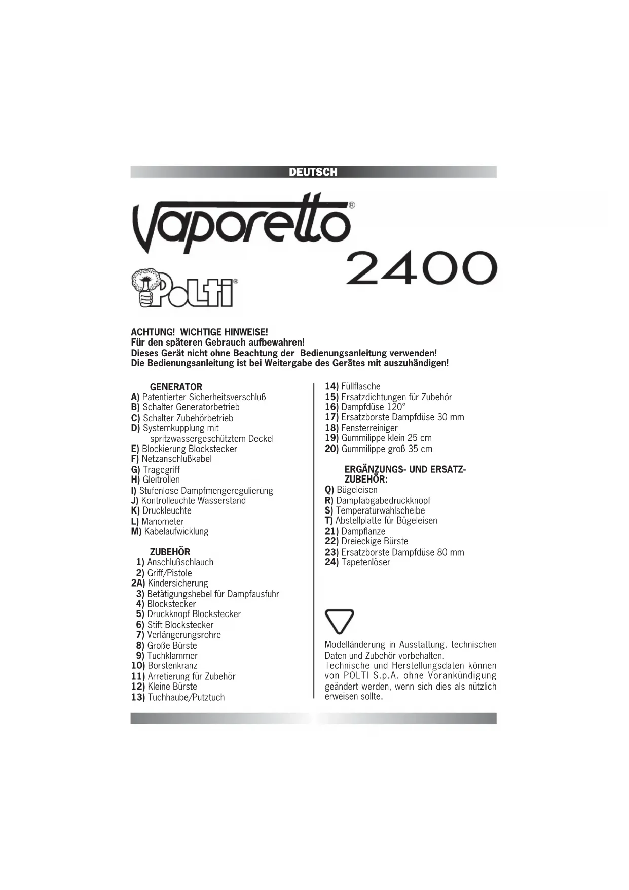 ACHTUNG! WICHTIGE HINWEISE! Für den späteren Gebrauch aufbewahren! Dieses Gerät nicht ohne Beachtung der Bedienungsanleitung verwenden! Die Bedienungsanleitung ist bei Weitergabe des Gerätes mit auszuhändigen!BITTE BEACHTEN ! Lesen Sie vor Inbetriebnahme diese Bedienungsanleitung sorgfältig durch, um Schäden und Gefahren durch nicht ordnunggemäßen Gebrauch zu vermeiden. Bewahren Sie die Bedienungsanleitung gut auf, damit Sie jederzeit einzeine Punkte nachlesen können. Bei der Weitergabe des Gerätes an andere Personen muß die Bedienungsanleitung mit ausgehändigt werden. Beachten Sie besonders die mit gekennzeichneten Sicherheitshinweise. Mit dem Vaporetto-Dampfreiniger haben Sie sich für schadstoffreie, umweltschonende Sauberkeit und Polti-perfekte Sicherheit entschieden: