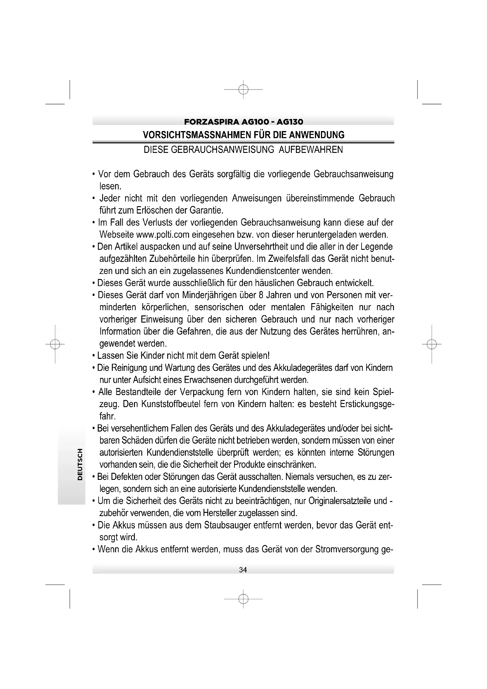 DEUTSCH - Das Gerät, das Kabel oder die Stecker niemals in Wasser oder andere Flüs- sigkeiten eintauchen. SICHERHEITSHINWEISE: Verletzungsgefahr und bestimmungsgemäßer Gebrauch des Geräts: - Dieses Gerät wurde ausschließlich für den häuslichen Gebrauch entwickelt. - Die Verwendung des Geräts in explosions- und feuergefährdeten Umgebungen ist verboten. - Dieses Gerät darf nur für die Reinigung und Trocknung von glatten Oberflächen, wie Fenstern, Fliesen und Spiegeln verwendet werden. - Es darf nur zusammen mit Wasser und eventuell handelsüblichem, nicht schäu- mendem Glasreiniger verwendet werden. - Das Gerät darf nicht zum Aufnehmen großer Mengen von Wasser verwendet werden. - Es darf nicht als Staubsauger verwendet werden. - Keine entzündlichen, explosiven, korrosiven, gesundheitsgefährdenden, reizen- den, tödlichen, giftigen, schaumbildenden Produkte aufsaugen. - Keine brennenden oder glühenden Objekte aufsaugen, wie Zigarettenstummel, Asche oder andere brennende oder glühende Materialien. - Das Gerät niemals der Witterung aussetzen. - Das Gerät nicht in der Nähe von eingeschalteten Kochherden, Elektroöfen oder, allgemein, in der Nähe von Wärmequellen aufstellen. - Das Gerät und das Akkuladegerät nicht Umgebungstemperaturen unter 0°C und über 40°C aussetzen. - Die Tasten nicht zu heftig drücken. Benutzen Sie keine spitzen Gegenstände, wie Stifte und Ähnliches. - Die Luftschlitze nicht verstopfen oder Gegenstände einführen. - Mit dem Strahl nicht auf Augen zielen oder spritzen. - Nicht auf Gegenstände spritzen, die elektrische Komponenten enthalten, wie zum Beispiel das Backofeninnere. - Bevor das Gerät und das Tuch auf empfindlichen Oberflächen eingesetzt wer- den, muss ein Test an nicht sichtbaren Stellen durchgeführt werden.FORZASPIRA AG100 - AG130