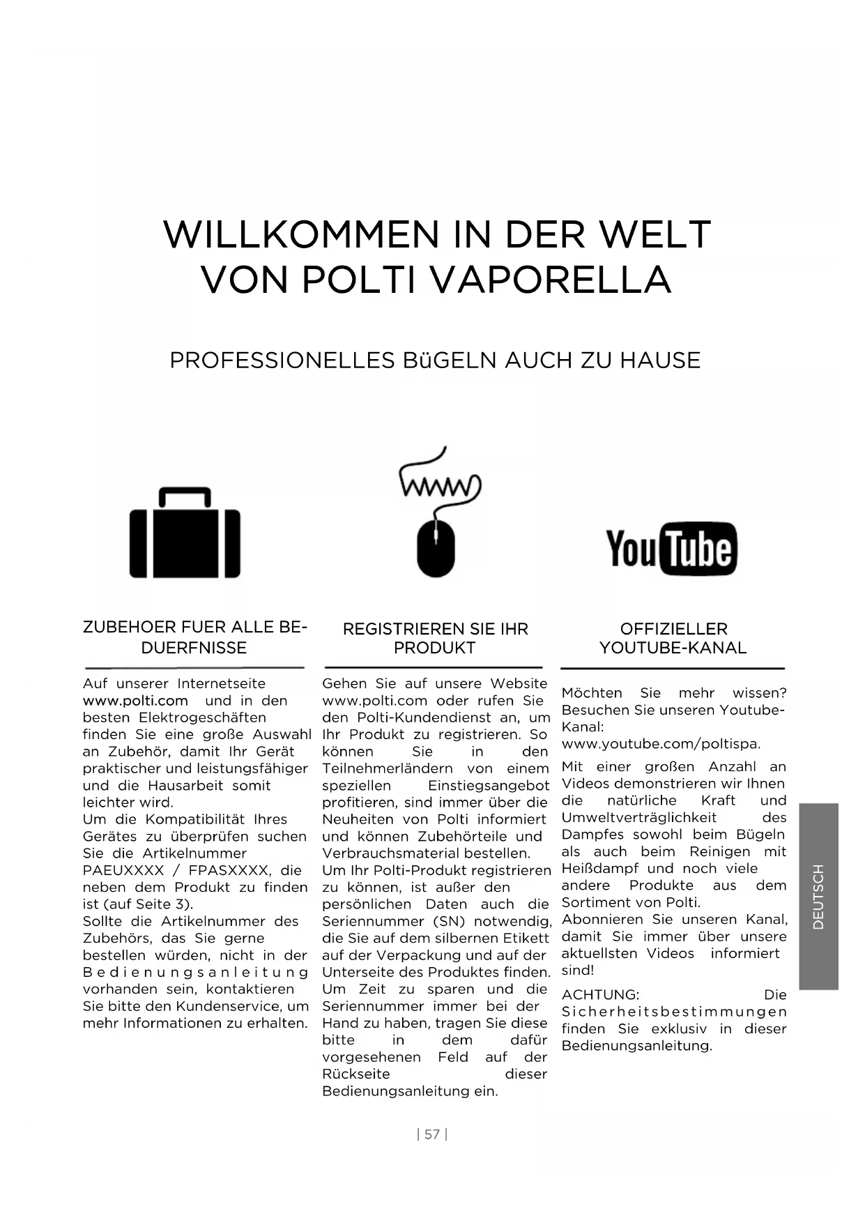PRODUKT Gehen Sie auf unsere Website www.polti.com oder rufen Sie den Polti-Kundendienst an, um Ihr Produkt zu registrieren. So können Sie in den Teilnehmerländern von einem speziellen Einstiegsangebot profitieren, sind immer über die Neuheiten von Polti informiert und können Zubehörteile und Verbrauchsmaterial bestellen. Um Ihr Polti-Produkt registrieren zu können, ist außer den persönlichen Daten auch die Seriennummer (SN) notwendig, die Sie auf dem silbernen Etikett auf der Verpackung und auf der Unterseite des Produktes finden. Um Zeit zu sparen und die Seriennummer immer bei der Hand zu haben, tragen Sie diese bitte in dem dafür vorgesehenen Feld auf der Rückseite dieser Bedienungsanleitung ein. OFFIZIELLER YOUTUBE-KANAL Möchten Sie mehr wissen? Besuchen Sie unseren Youtube- Kanal: www.youtube.com/poltispa. Mit einer großen Anzahl an Videos demonstrieren wir Ihnen die natürliche Kraft und Umweltverträglichkeit des Dampfes sowohl beim Bügeln als auch beim Reinigen mit Heißdampf und noch viele andere Produkte aus dem Sortiment von Polti. Abonnieren Sie unseren Kanal, damit Sie immer über unsere aktuellsten Videos informiert sind! ACHTUNG: Die S i c h e r h e i t s b e s t i m m u n g e n finden Sie exklusiv in dieser Bedienungsanleitung.SICHERHEITSHINWEISE WICHTIGE VORSICHTSMASSNAHMEN ACHTUNG! VOR DEM GEBRAUCH DES GERÄTS ALLE