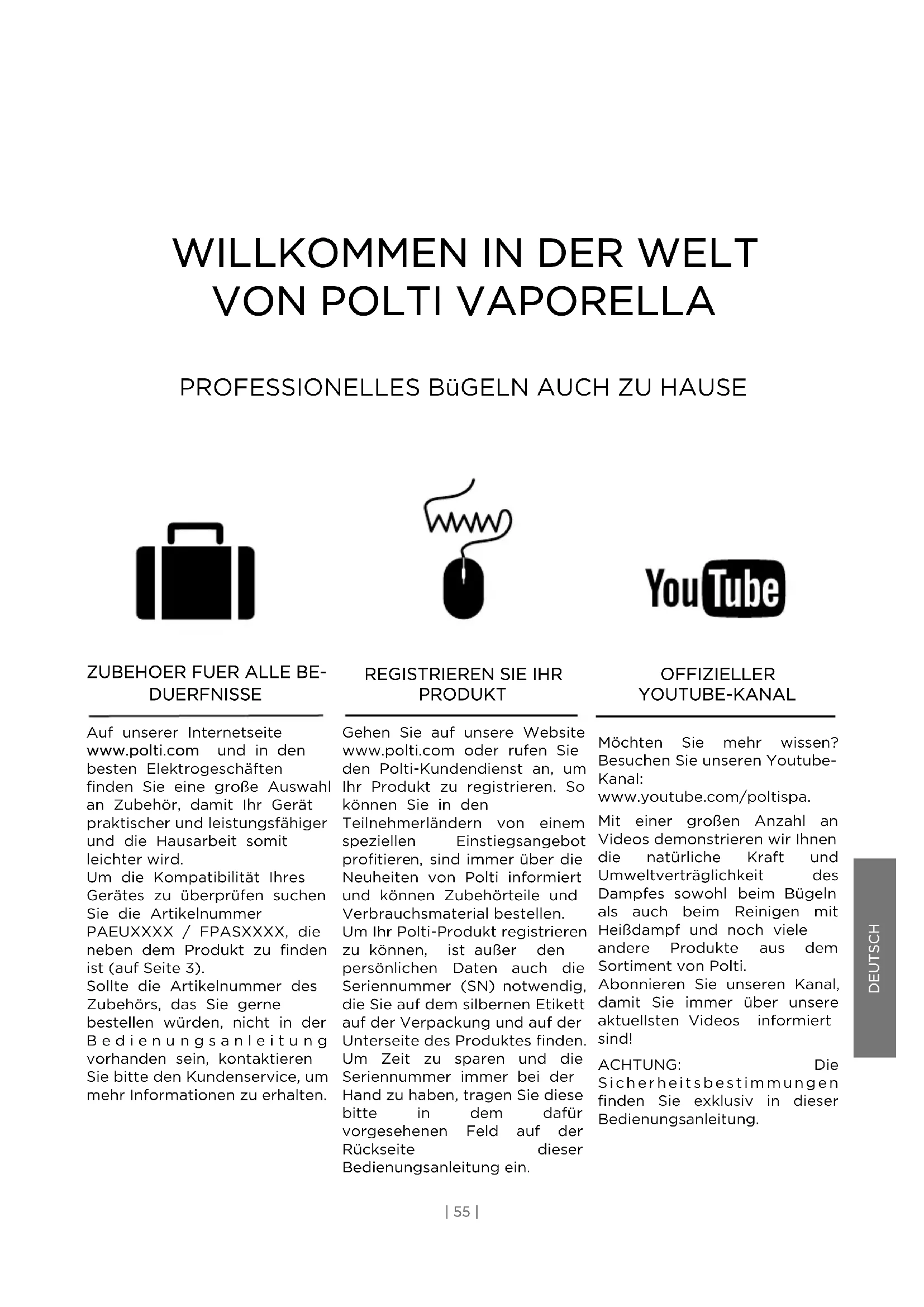 PRODUKT Gehen Sie auf unsere Website www.polti.com oder rufen Sie den Polti-Kundendienst an, um Ihr Produkt zu registrieren. So können Sie in den Teilnehmerländern von einem speziellen Einstiegsangebot profitieren, sind immer über die Neuheiten von Polti informiert und können Zubehörteile und Verbrauchsmaterial bestellen. Um Ihr Polti-Produkt registrieren zu können, ist außer den persönlichen Daten auch die Seriennummer (SN) notwendig, die Sie auf dem silbernen Etikett auf der Verpackung und auf der Unterseite des Produktes finden. Um Zeit zu sparen und die Seriennummer immer bei der Hand zu haben, tragen Sie diese bitte in dem dafür vorgesehenen Feld auf der Rückseite dieser Bedienungsanleitung ein. OFFIZIELLER YOUTUBE-KANAL Möchten Sie mehr wissen? Besuchen Sie unseren Youtube- Kanal: www.youtube.com/poltispa. Mit einer großen Anzahl an Videos demonstrieren wir Ihnen die natürliche Kraft und Umweltverträglichkeit des Dampfes sowohl beim Bügeln als auch beim Reinigen mit Heißdampf und noch viele andere Produkte aus dem Sortiment von Polti. Abonnieren Sie unseren Kanal, damit Sie immer über unsere aktuellsten Videos informiert sind! ACHTUNG: Die S i c h e r h e i t s b e s t i m m u n g e n finden Sie exklusiv in dieser Bedienungsanleitung.SICHERHEITSHINWEISE WICHTIGE VORSICHTSMASSNAHMEN ACHTUNG! VOR DEM GEBRAUCH DES GERÄTS ALLE