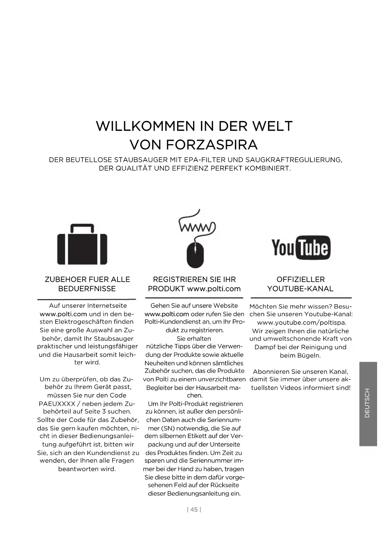 BEDUERFNISSE Auf unserer Internetseite www.polti.com und in den be- sten Elektrogeschäften finden Sie eine große Auswahl an Zu- behör, damit Ihr Staubsauger praktischer und leistungsfähiger und die Hausarbeit somit leich- ter wird. Um zu überprüfen, ob das Zu- behör zu Ihrem Gerät passt, müssen Sie nur den Code PAEUXXXX / neben jedem Zu- behörteil auf Seite 3 suchen. Sollte der Code für das Zubehör, das Sie gern kaufen möchten, ni- cht in dieser Bedienungsanlei- tung aufgeführt ist, bitten wir Sie, sich an den Kundendienst zu wenden, der Ihnen alle Fragen beantworten wird. OFFIZIELLER YOUTUBE-KANAL Möchten Sie mehr wissen? Besu- chen Sie unseren Youtube-Kanal: www.youtube.com/poltispa. Wir zeigen Ihnen die natürliche und umweltschonende Kraft von Dampf bei der Reinigung und beim Bügeln. Abonnieren Sie unseren Kanal, damit Sie immer über unsere ak- tuellsten Videos informiert sind!