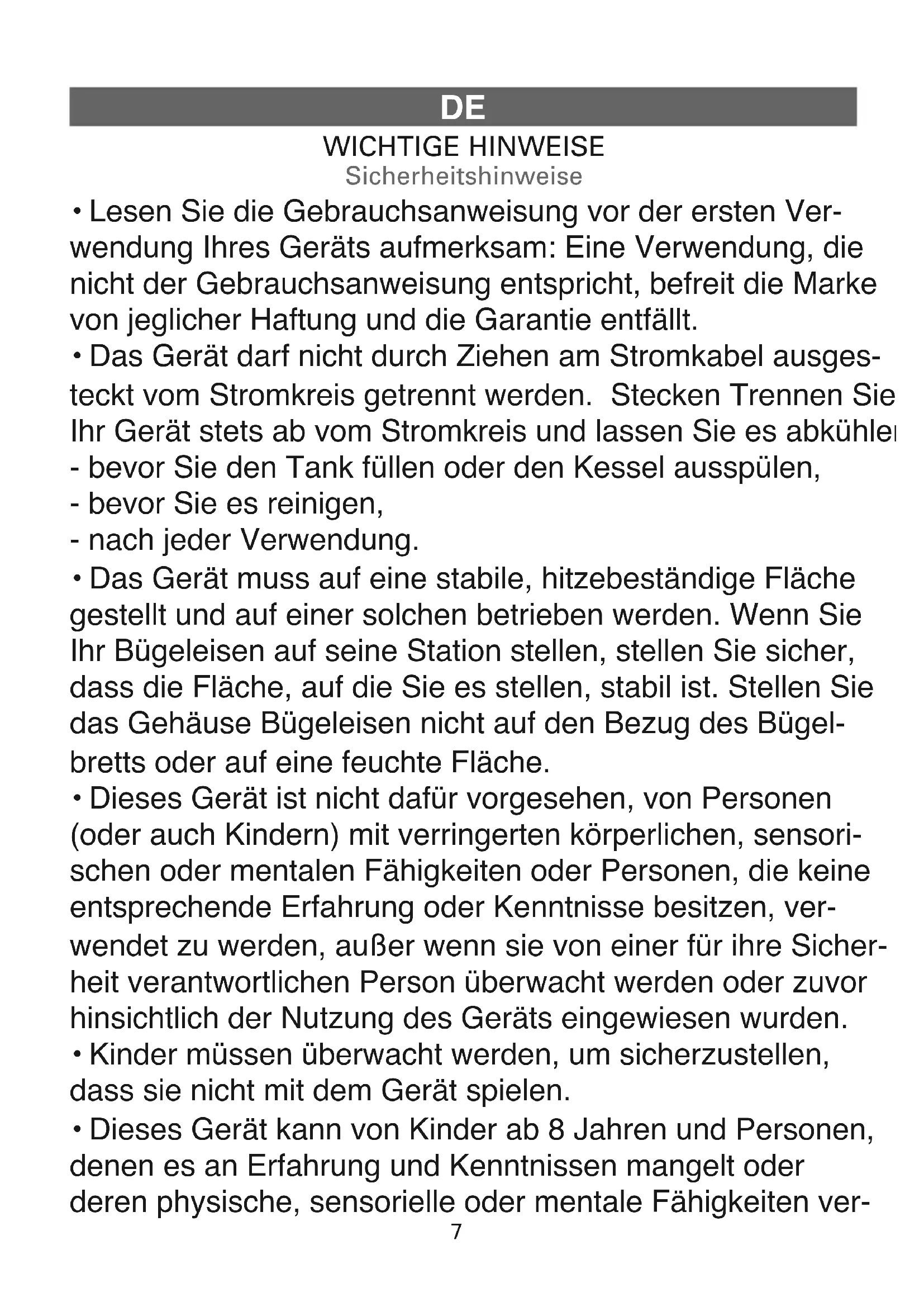 - Lesen Sie die Gebrauchsanweisung vor der ersten Ver- wendung Ihres Geräts aufmerksam: Eine Verwendung, die nicht der Gebrauchsanweisung entspricht, befreit die Marke von jeglicher Haftung und die Garantie entfällt.