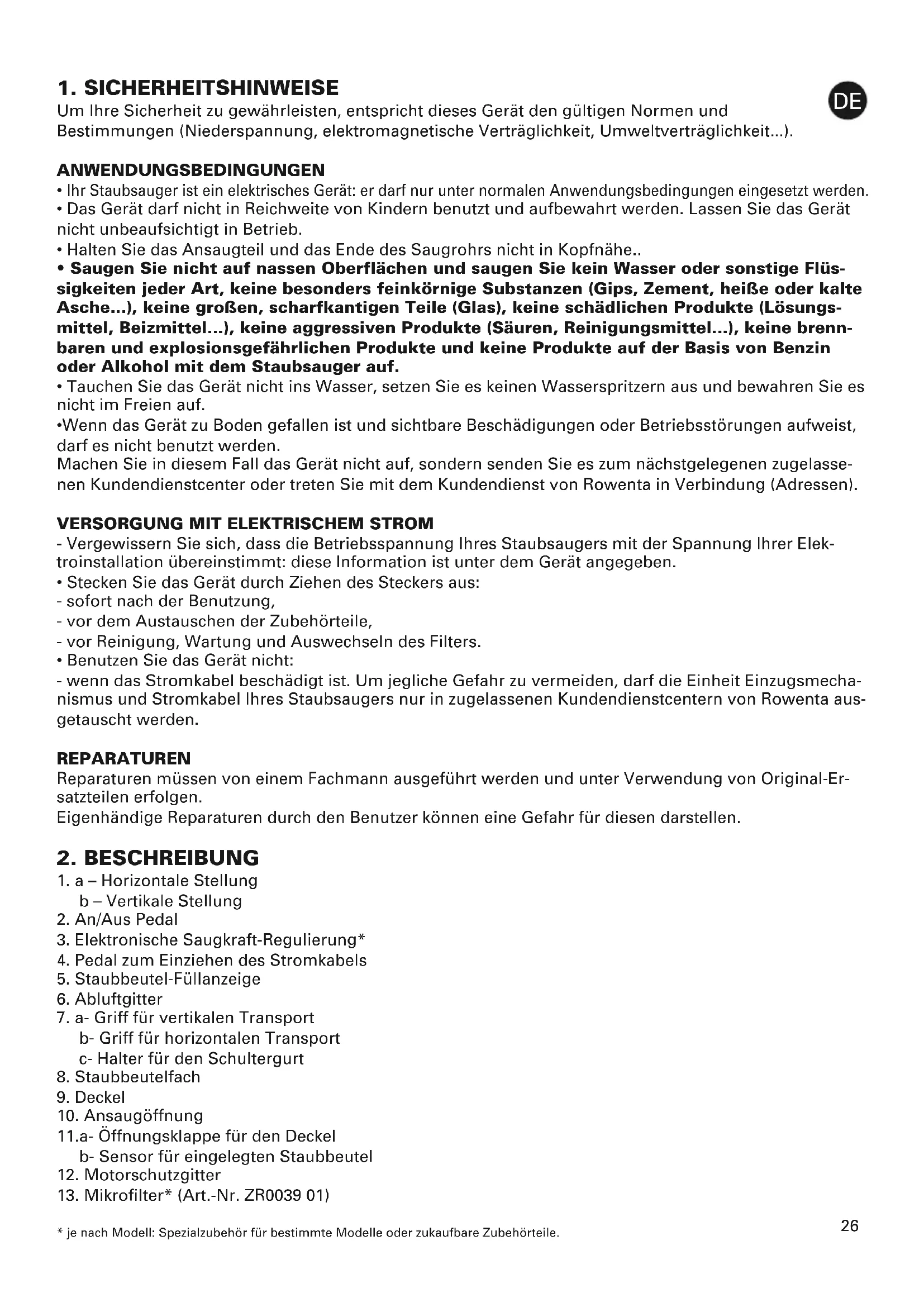 - Dieses Gerät ist ausschließlich für den Haushalts- und Hausgebrauch bestimmt: bei unsachgemäßer oder der Ge- brauchsanweisung nicht entsprechender Nutzung übernimmt Rowenta keinerlei Haftung und die Garantie erlischt.