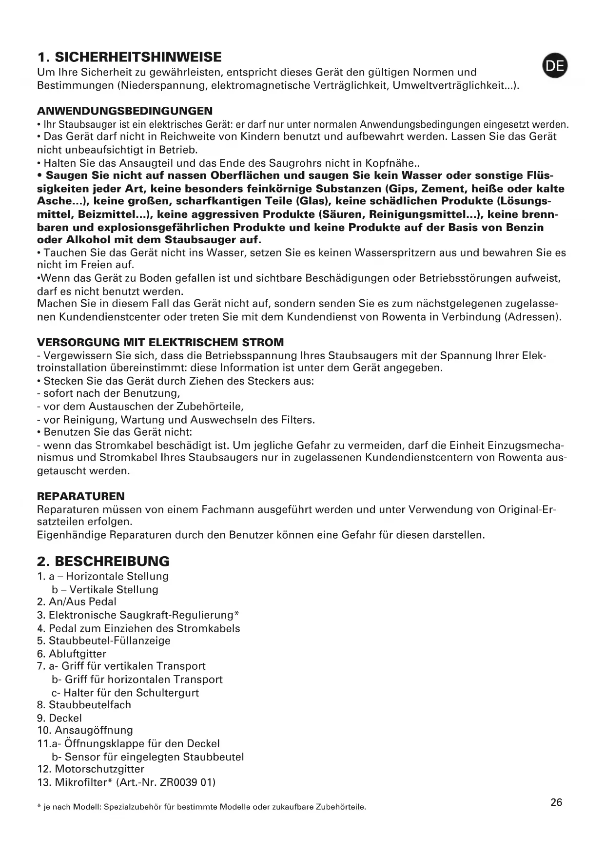 - Sollten Sie Schwierigkeiten haben, die Zubehörteile und Filter für diesen Staubsauger im Handel zu fin- den, treten Sie bitte mit dem Kundendienst von Rowenta in Kontakt (siehe Adressen im Service Spiegel).