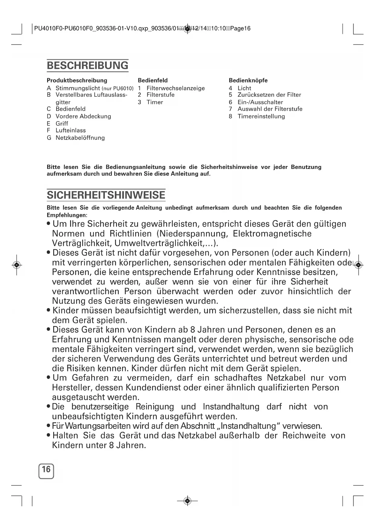 PU4010F0-PU6010F0_903536-01-V10.qxp_903536/0112/12/1410:10Page1516 BESCHREIBUNG Bitte lesen Sie die Bedienungsanleitung sowie die Sicherheitshinweise vor jeder Benutzung aufmerksam durch und bewahren Sie diese Anleitung auf. SICHERHEITSHINWEISE Bitte lesen Sie die vorliegende Anleitung unbedingt aufmerksam durch und beachten Sie die folgenden Empfehlungen:
