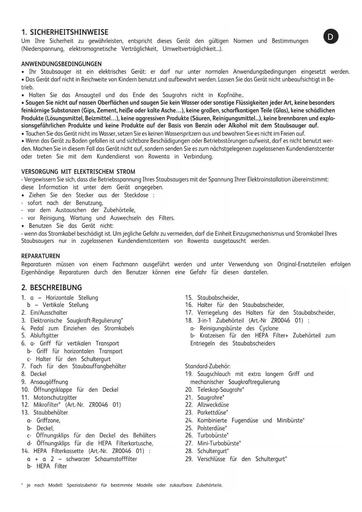 - Benutzen Sie das Gerät nicht: - wenn das Stromkabel beschädigt ist. Um jegliche Gefahr zu vermeiden, darf die Einheit Einzugsmechanismus und Stromkabel Ihres Staubsaugers nur in zugelassenen Kundendienstcentern von Rowenta ausgetauscht werden. REPARATUREN Reparaturen müssen von einem Fachmann ausgeführt werden und unter Verwendung von Original-Ersatzteilen erfolgen. Eigenhändige Reparaturen durch den Benutzer können eine Gefahr für diesen darstellen.