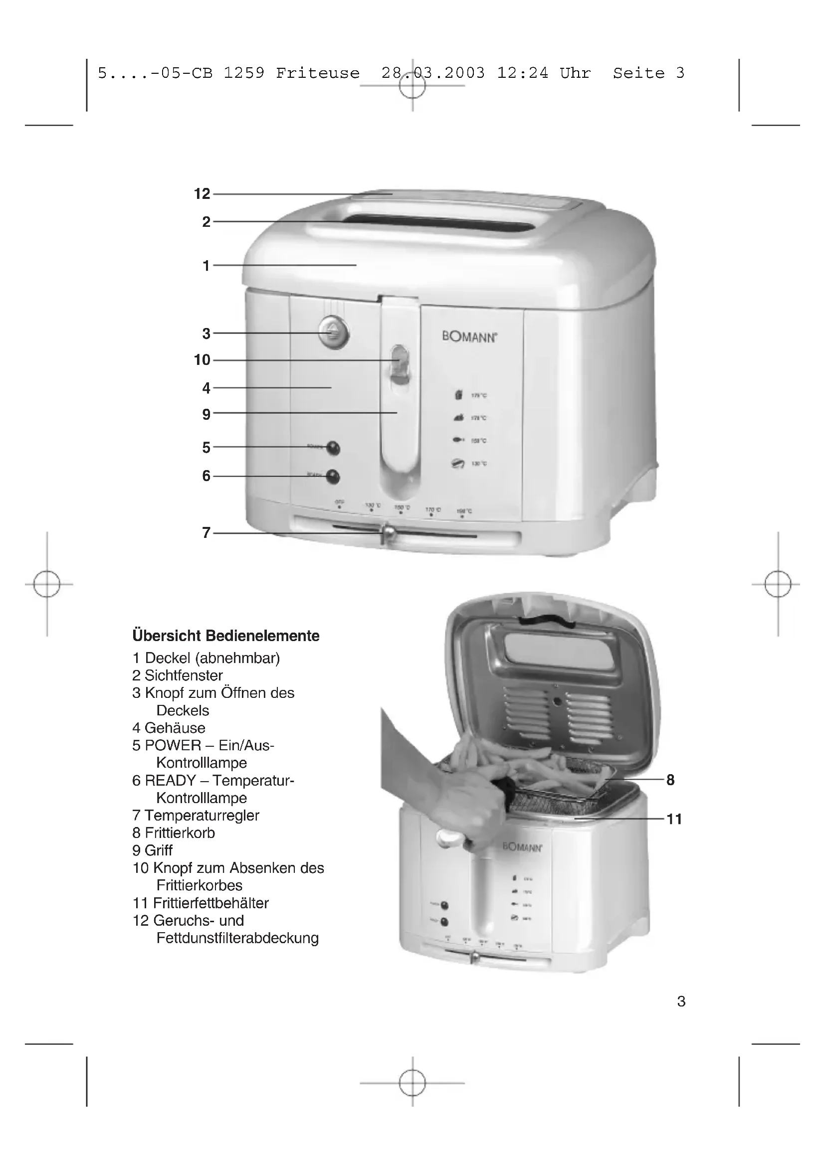 5....-05-CB 1259 Friteuse 28.03.2003 12:24 Uhr Seite 23 Übersicht Bedienelemente 1 Deckel (abnehmbar) 2 Sichtfenster 3 Knopf zum Öffnen des Deckels 4 Gehäuse 5 POWER – Ein/Aus- Kontrolllampe 6 READY – Temperatur- Kontrolllampe 7 Temperaturregler 8 Frittierkorb 9 Griff 10 Knopf zum Absenken des Frittierkorbes 11 Frittierfettbehälter 12 Geruchs- und Fettdunstfilterabdeckung