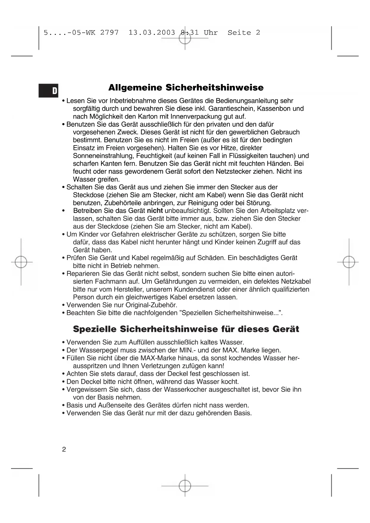 5....-05-WK 2797 13.03.2003 8:31 Uhr Seite 2Inbetriebnahme des Gerätes Bitte lesen Sie diese Bedienungsanleitung sorgfältig durch und bewahren Sie diese an einem sicheren Ort auf. Vor der ersten Verwendung kochen Sie das Gerät bitte 2x mit frischem Wasser aus – Bitte benutzen Sie nur klares Wasser ohne Zusatzmittel. Bedienung