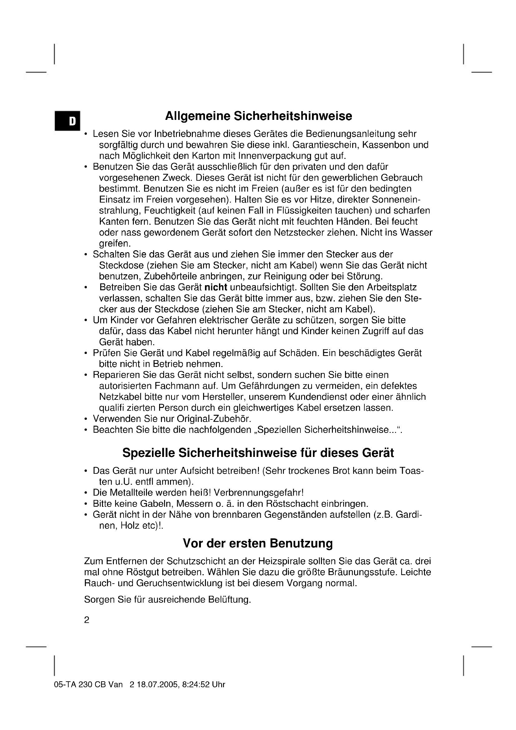 - Das Gerät nur unter Aufsicht betreiben! (Sehr trockenes Brot kann beim Toasten u.U. entflammen).