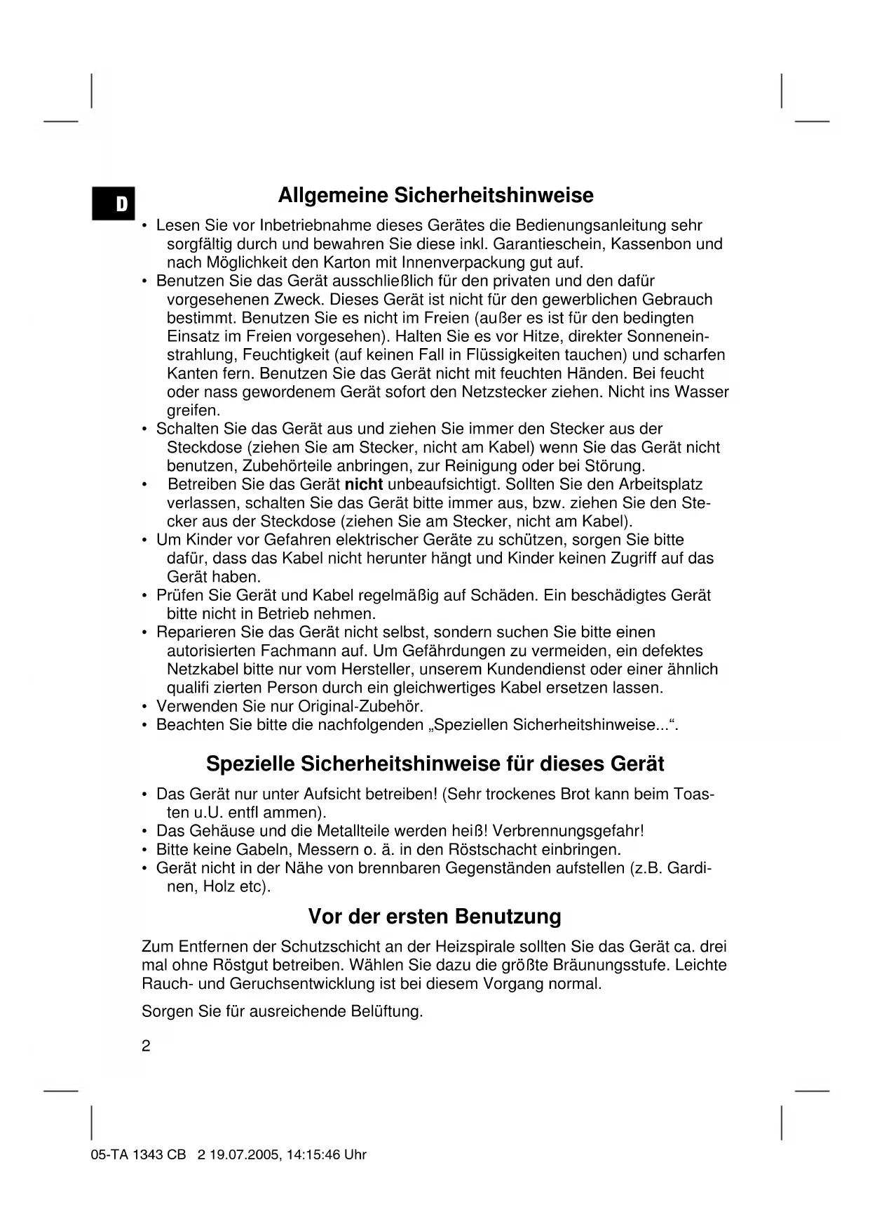 - Das Gerät nur unter Aufsicht betreiben! (Sehr trockenes Brot kann beim Toasten u.U. entflammen).