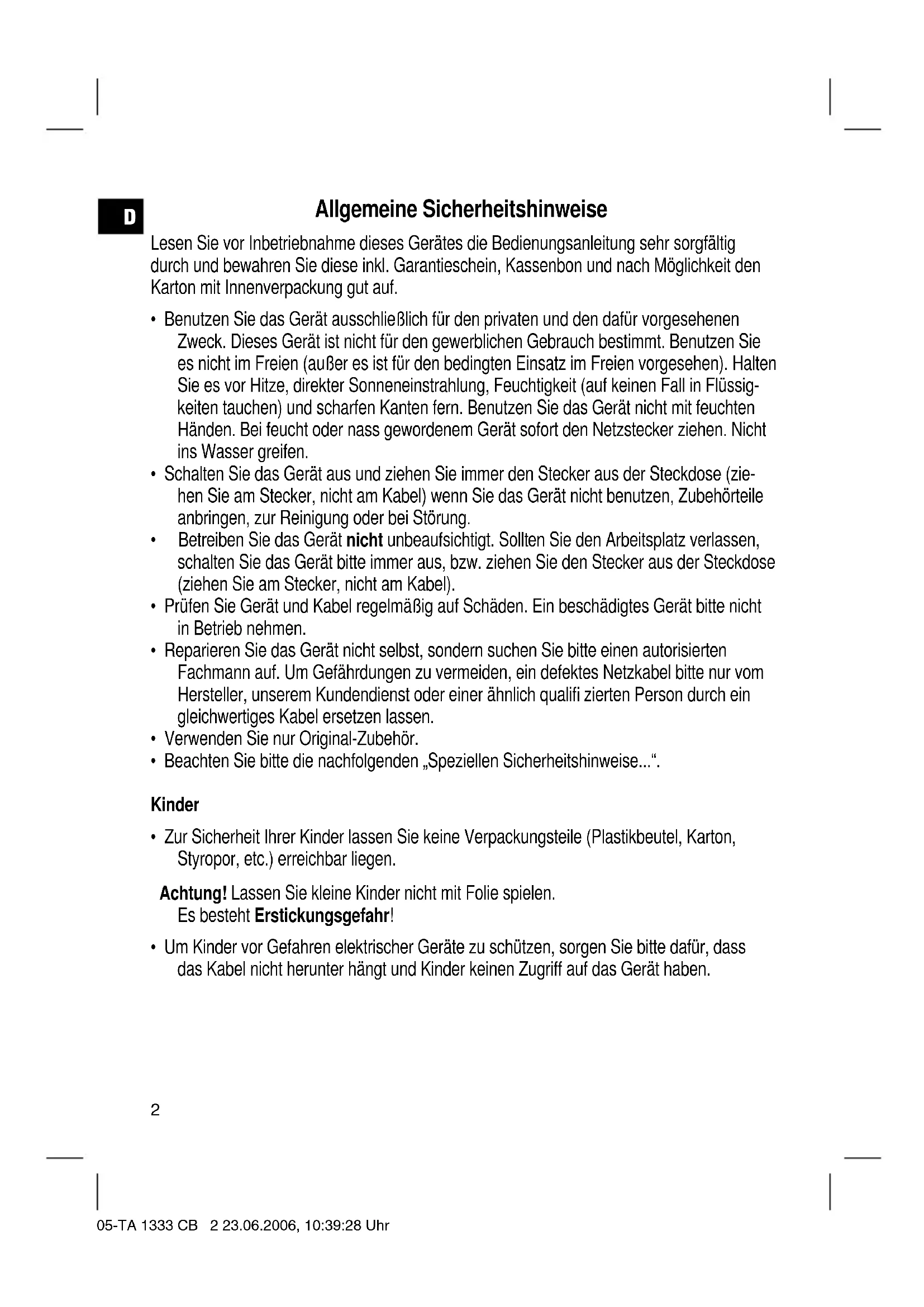 - Um Kinder vor Gefahren elektrischer Geräte zu schätzen, sorgen Sieitte davon, dass das Kabel nicht herunter hangt und Kinder keinener Zugriff auf das Gerät haben.