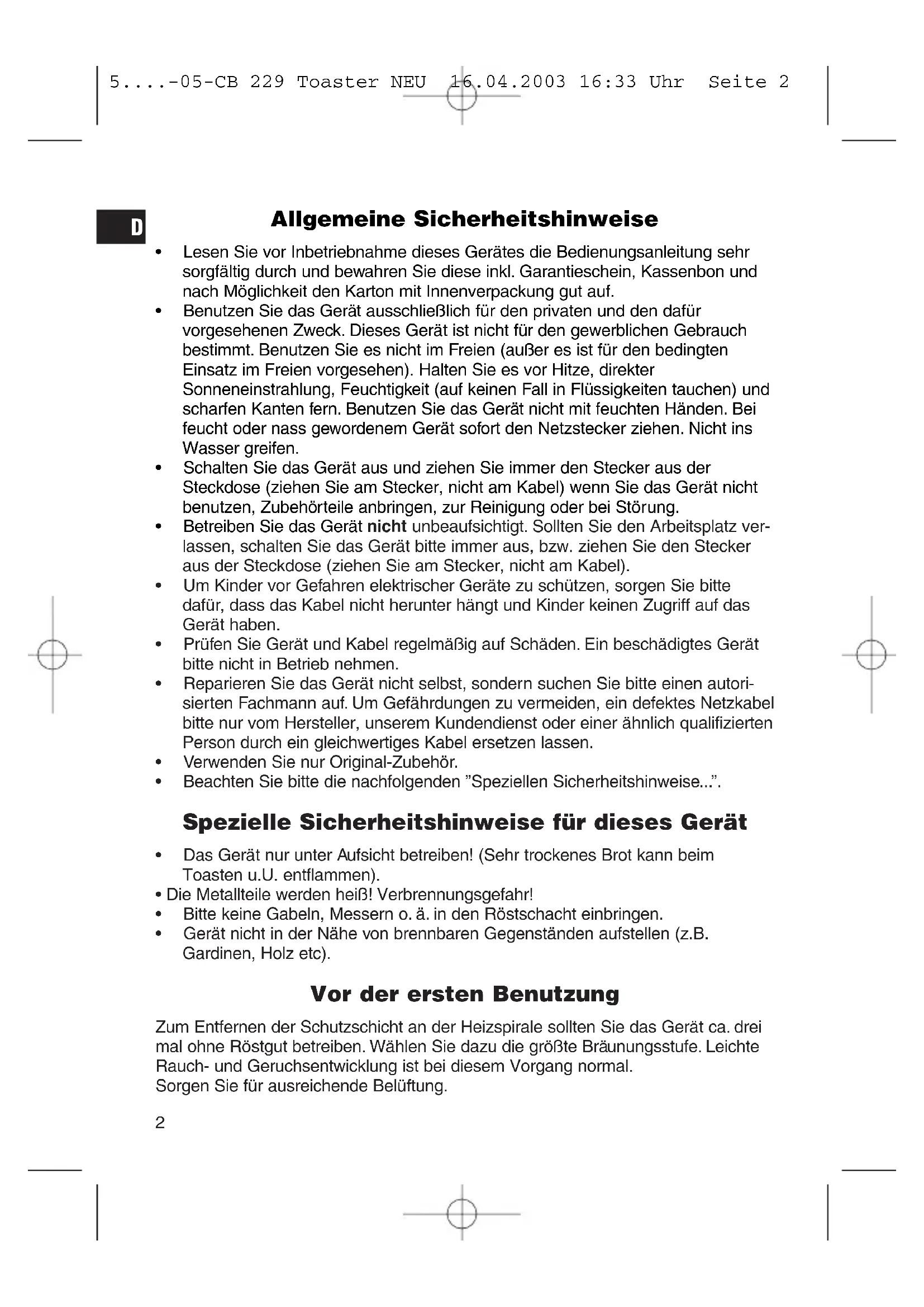 - Das Gerät nur unter Aufsicht betreiben! (Sehr trockenes Brot kann beim Toasten u.U. entflammen).
